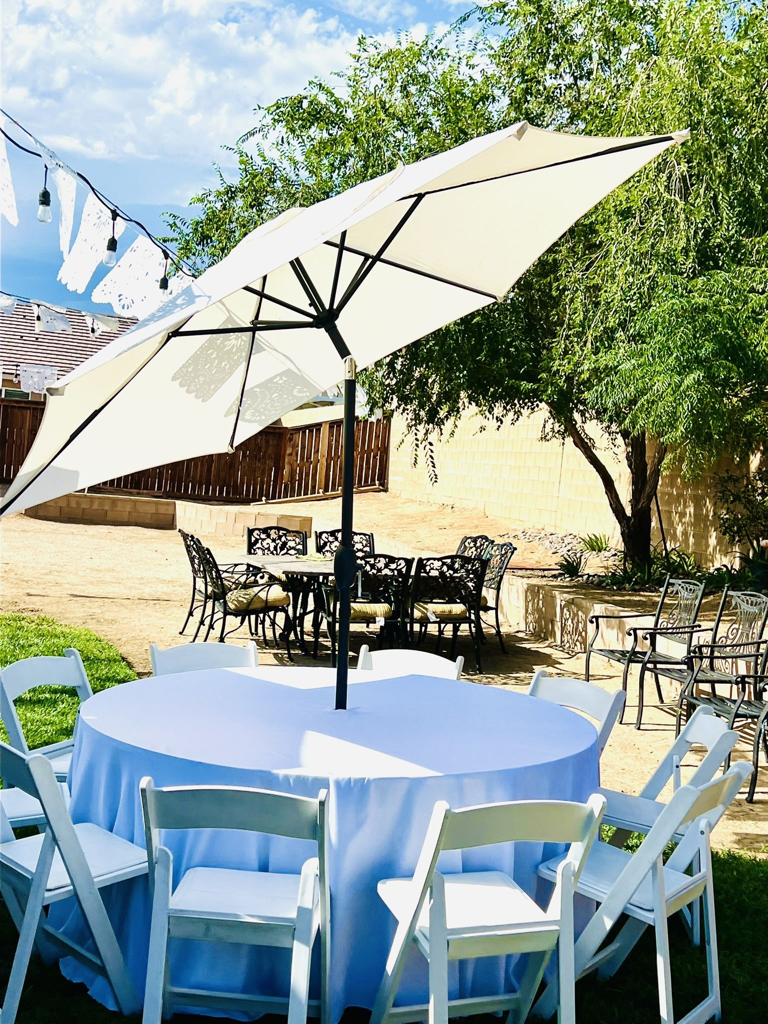 Umbrella sets includes tables, umbrella, plastic folding chairs and linens R. E. N. T. A. L. Adelanto, Victorville, phelan, apple valley, Little Rock, spring valley lake, oak hill, hisperia, piñon hills, wrightwood , lake Los Angeles , Pearblossom, sun village