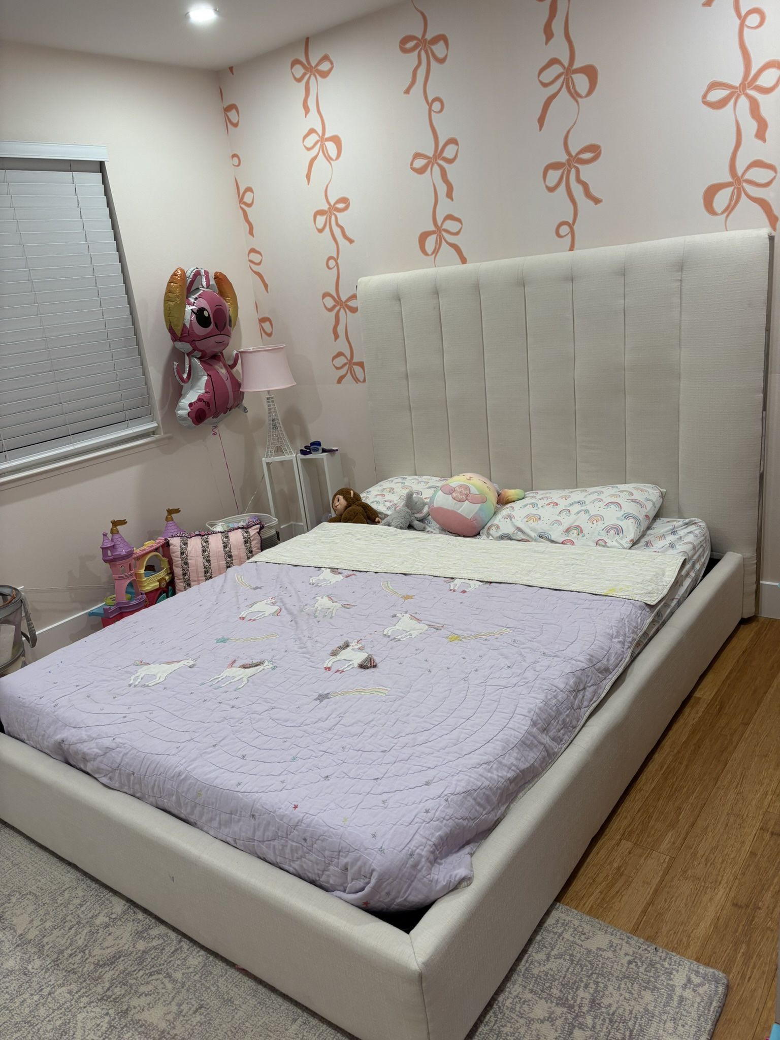 Contemporary bed- upholstered queen size bed with metallic trim. As good as new condition. Mattress included $500