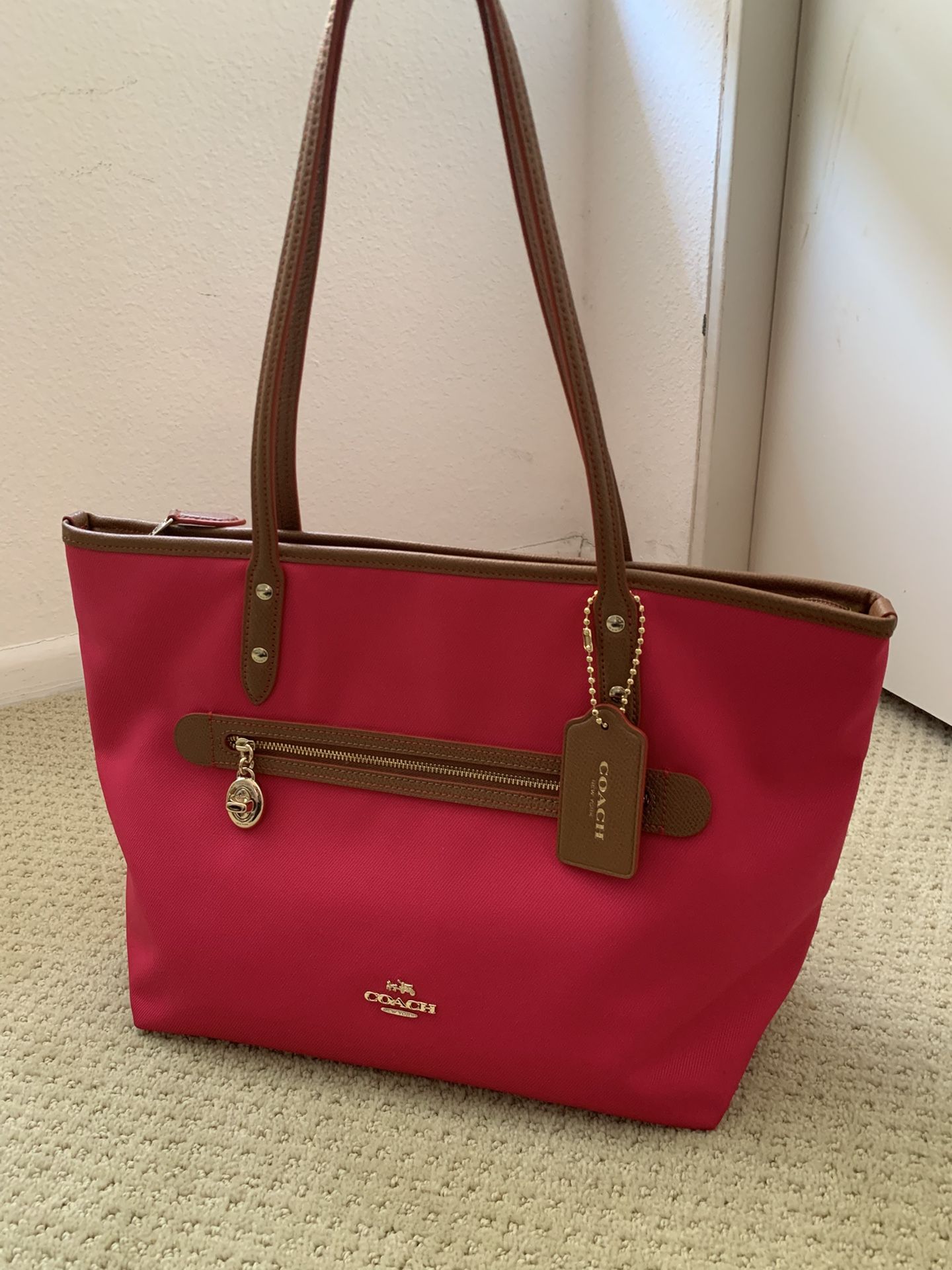 COACH canvas tote shoulder bag. F37237 Sawyer Canvas Zip Tote Pink Ruby There is one outside pocket with zipper. There are three pockets inside, one pocket with zipper. Beautiful with leather trim and straps, pretty color red/pink. Comes with the coach tag.