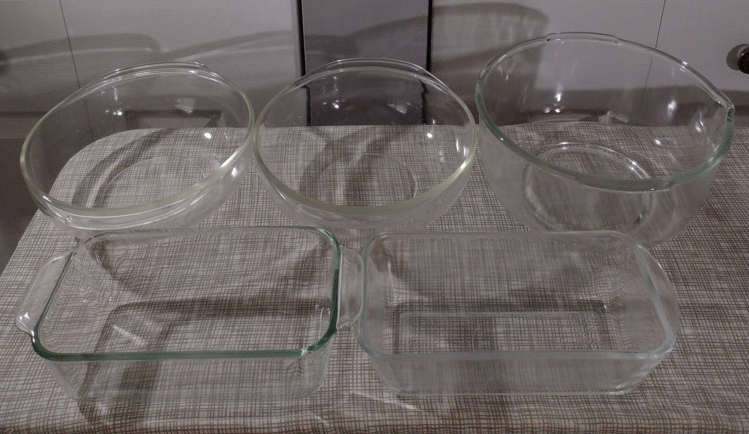 Used, no chips or cracks, some scratches from everyday use, (2) 2 qt Pirex bowls, (1) 3 qt no brand bowl with spout, (2) 1.5 qt loaf dishes Pirex & Glassbake, sorry no shipping, if you see it is available, cash only.