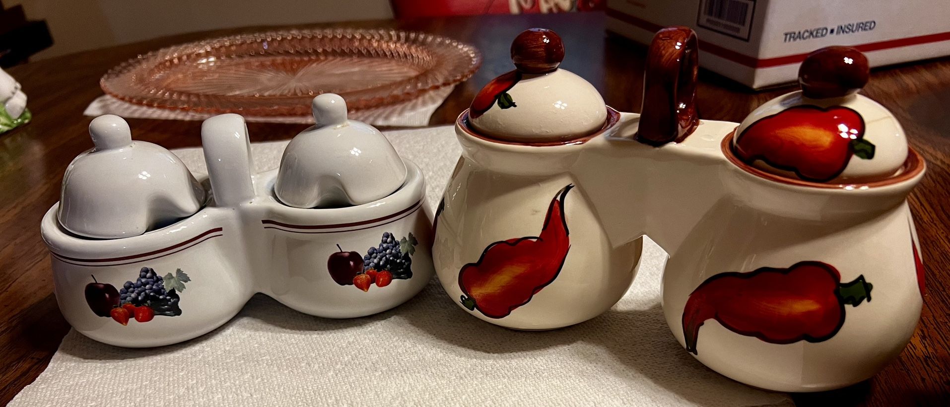 Cleaning out my mother-in-law’s house who recently passed. Except reasonable offers. Try to provide the best photos and information. Will only meet in Logan, Chapmanville or Harts areas. Shipping is on the post. Questions, please ask. CHECK OUT MY OTHER POSTS!!!! 2 sets of condiment servers. Houston harvest and jalapeno hand painted server set. Jalapeno set has a small crack on lid.