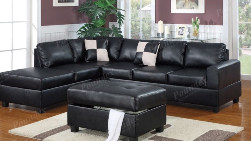 Everything is new in box, never used. Dive into luxury with the 3-piece sectional. Covered in bonded leather, this sectional includes a changeable chaise for versatility and style. Its plush cushions make it a perfect piece for the bachelor or family. *Ottoman included* Available in black or dark brown. Delivery available, hablamos Español