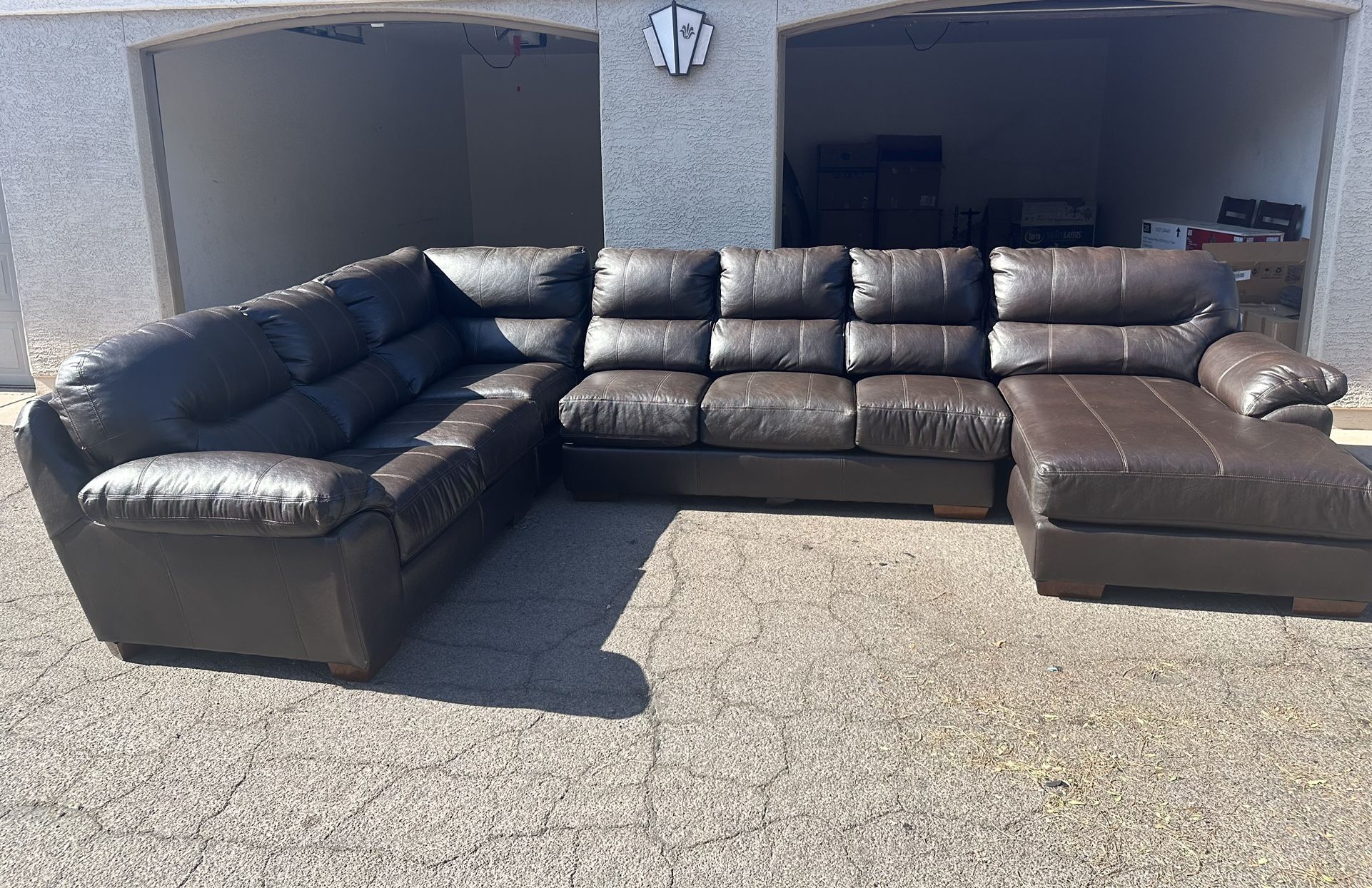 4 Piece Sectional - Sits 7 - Real Leather - Does not recline 160 inches wide 64 inches long (Chaise) 98 inches long (Loveseat) Damaged/scratches from pets Expect some dog hair inside the couch Needs a deep clean Pick Up Only Originally purchased from American Furniture Warehouse