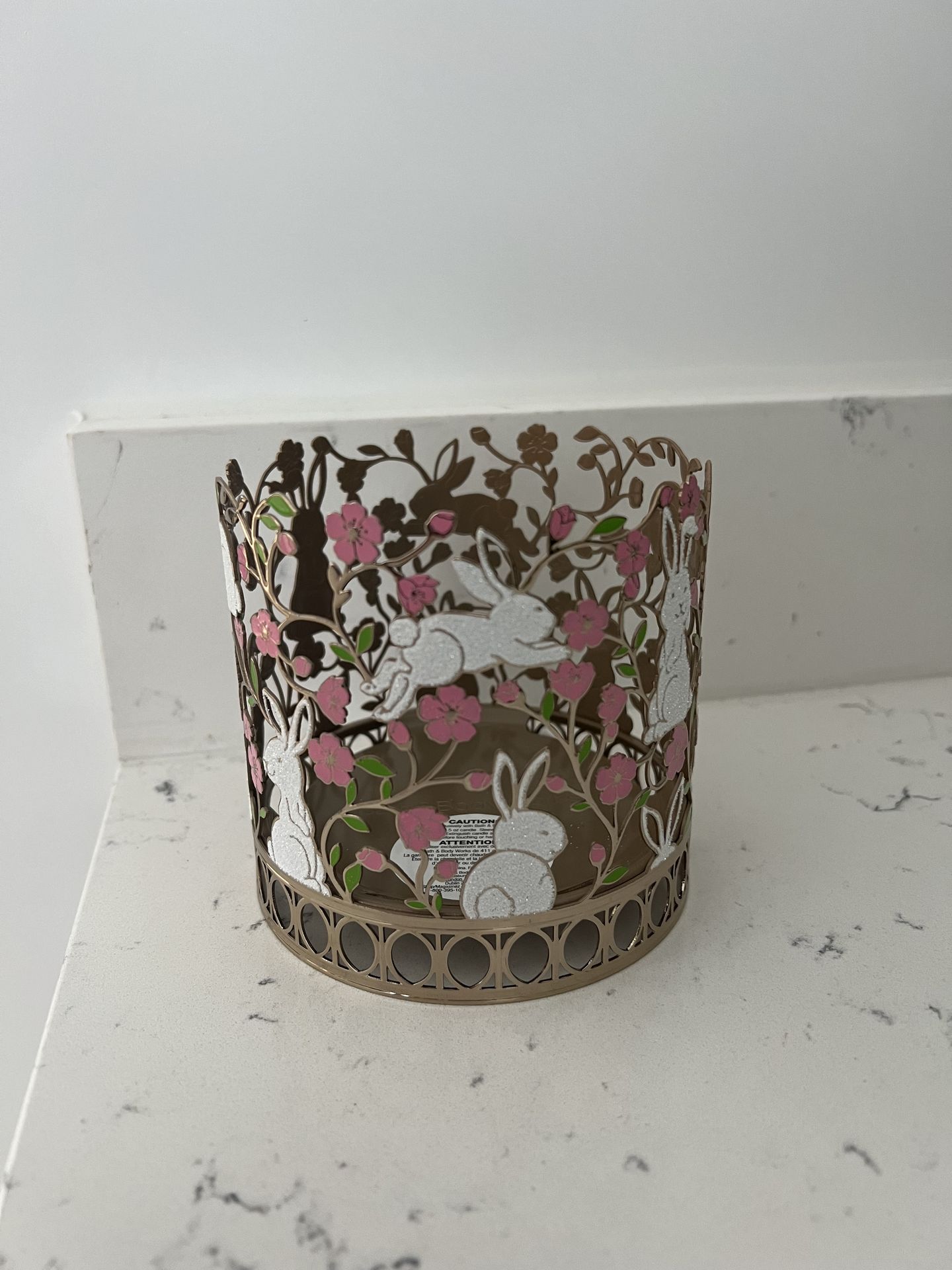 SERIOUS BUYERS ONLY, PLEASE!! NEW 3-wick Candle HOLDER • Theme: Bunnies & Flowers • Colors: Gold, White, Pink & Green • Measures: 4" (tall) × 4 1/4" (diameter) PET & SMOKE FREE HOME PLEASE, View my page, click on "MY PROFILE PICTURE & scroll down" for more selling items, THANK YOU!!