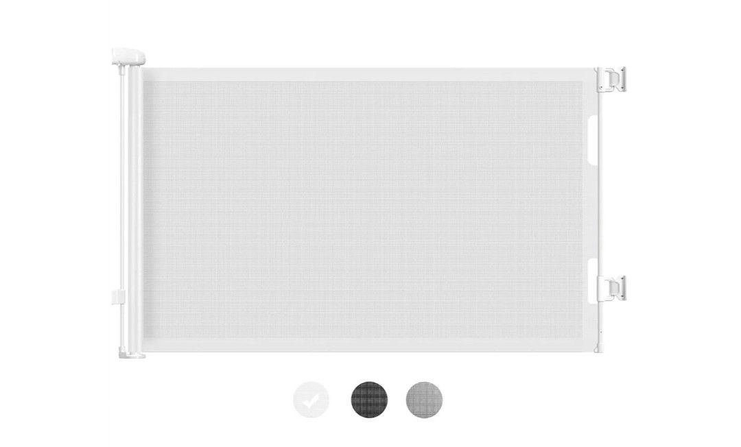 NEW HAMOPY Retractable Baby Gate, 33" Tall, Extends up to 71" Extra Wide Baby Gate, Durable Auto-Lock Mesh Dog Gate, Pets and Child Safety Gates for Stairs, Doorways, Hallways, Indoor, Outdoor(White) Material: Mesh Fabric & Plastic Color: White Brand: HAMOPY Product Dimensions: 71"W x 33"H Mounting Type: Wall Mount Target Species: Baby, Dogs, Cats, Pets, Child 【EXTRA WIDE RETRACTABLE BABY GATES】- Our baby gate retractable can be extended up to 71 inches wide max and 33 inches tall, which is designed to fit almost any gate/stairs. Mesh can be completely retracted away when not in use, saving your space. The baby gates extra wide unlike other doors, does not have a bar at the bottom, so you are not in danger of tripping over it. 【NEW AUTOMATIC LOCKING DESIGN】- The new on/off design of our safety gate barriers makes it easy to lock and unlock the baby gates with a simple pushes the ball cap. What's more, if you accidentally forget to lock the door, it will automatically lock in 15 to 30 seconds for added security! Simple operation allows you to easily open and close retractable baby gate for stairs while holding your baby or a diaper. 【DURABLE MATERIAL FOR SAFETY USE】- This large baby gate is made of durable and soft mesh to prevent your baby from any hurt when they accidentally bumped into the door. This material is durable even if you use a retractable mesh baby gate outdoors and expose it to the elements, it stays in place. It is also strong enough to withstand the pulling force of babies or small pets, protecting children from accidents. 【PERFECT FOR INDOOR & OUTDOOR】 - The Outdoor baby gate is designed to adjust to any door and stairs, perfect mesh dog gate retractable for doorways, stairways, hallways, indoor and outdoor use. Our baby safety gates with gates come with upgraded lower gate brackets that are height adjustable to accommodate different baseboard heights. Ensures reliable and safe protection for the entire house. A good quality expandable gates for kids or pets can give you more peace of mind. 【EASY INSTALLATION】- With the tools provided, you can have your new mesh child gate installed in minutes. What you will get: expandable baby gate x1, bracket x2, latch x2, wall anchors x8, screws x8, instructions x1, floor hook x1. The baby gates extra wide can be easily disassembled for installation, put away, or moved to another location. 3752