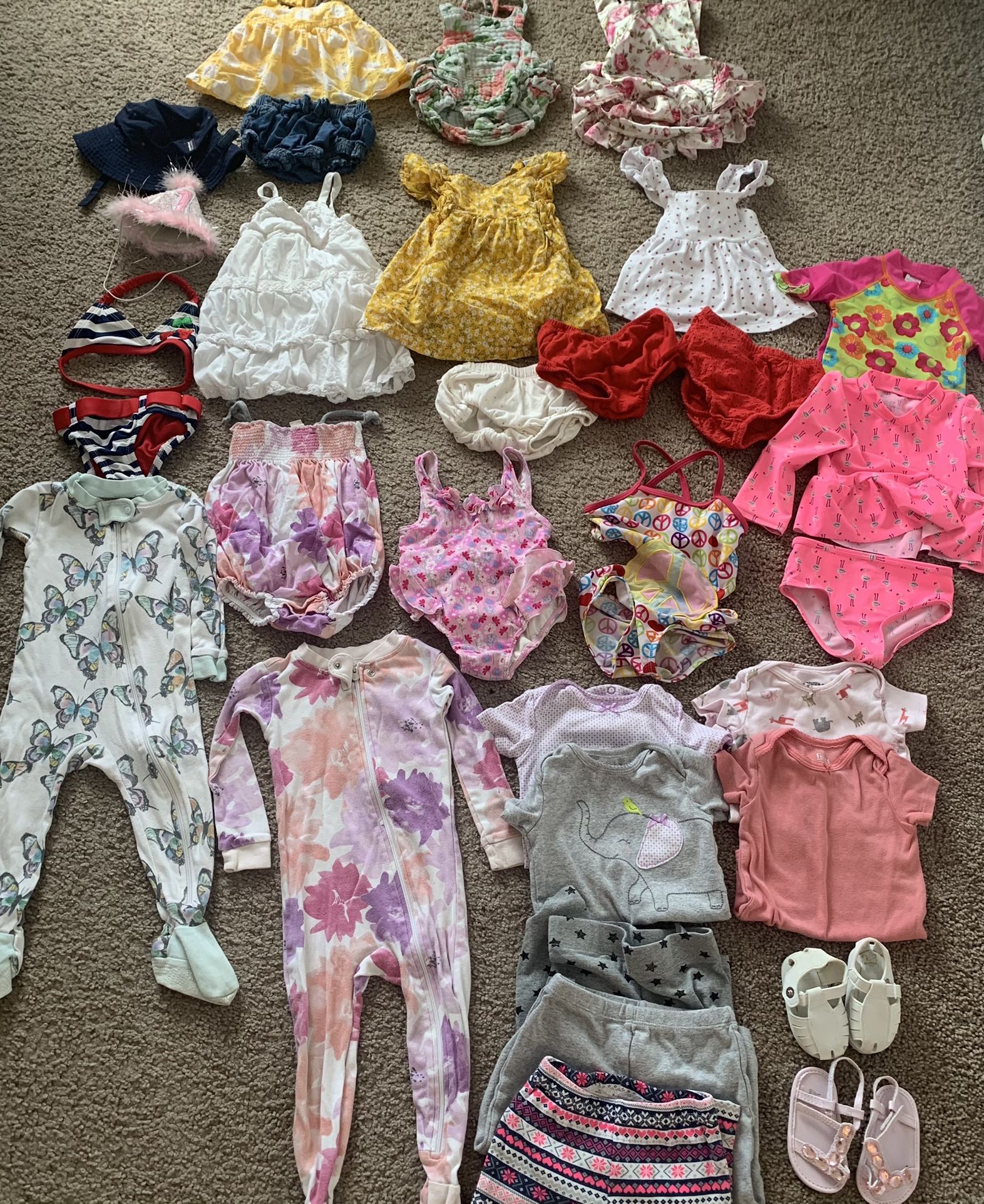Mostly 12 months size. All in excellent condition except some wear on the flamingo swim suit bottoms (sand from beach wouldn’t come out). Super cute patagonia sun hat, summer dresses, 4th of July outfit, swim suits, spf sun shirts, 3 Burt’s bees outfits (2 are jammies), 1 other organic summer onesie, sandals, and more.