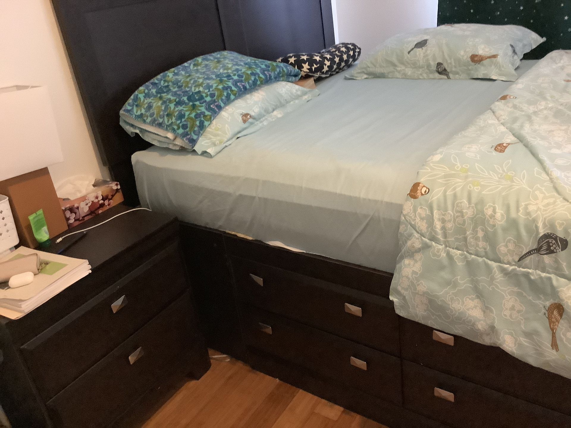 This bedroom sets include a Bed Frame with 12 drawers on its sides, one dresser with mirror, one night stand and a queen size mattress