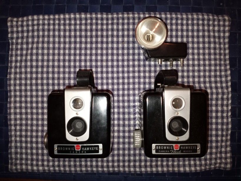 The price is for all 3 cameras 2 - Kodak Brownie Hawkeye Box Cameras One camera has a flash attachment and includes the original box. 1 - Kodak Brownie Starmatic Camera Note: I cannot verify that these cameras are fully operational, however, the two box cameras are in good shape.... just normal usage....from years ago. The film container on the 3rd camera does not presently stay closed, however, this could be repaired.