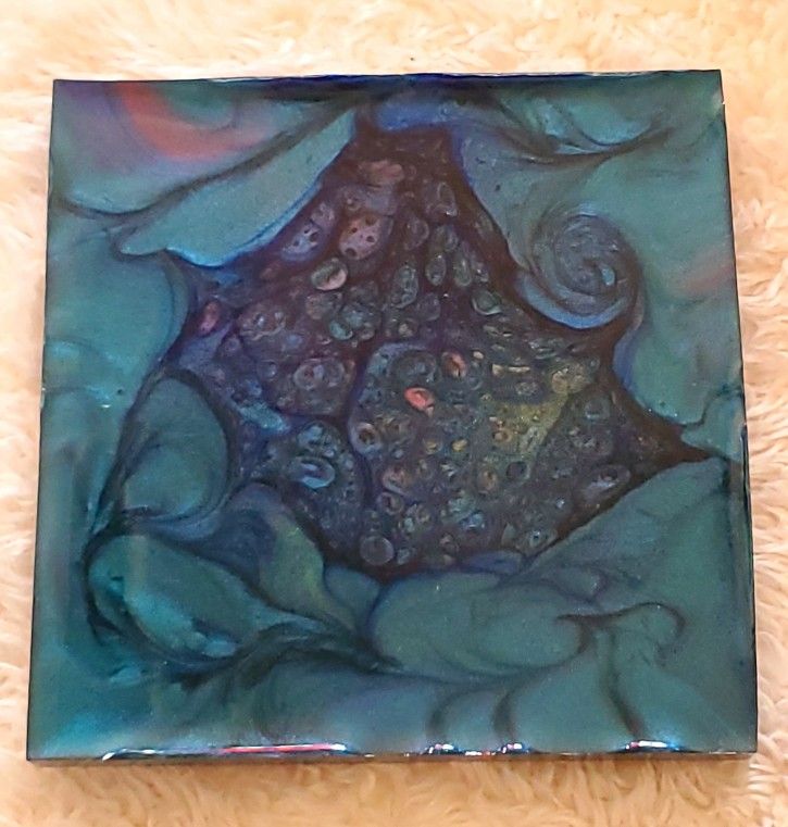 One of a kind piece of abstract art. Measures 4"x4". Can be used as a coaster or displayed as is. Includes acrylic display stand.