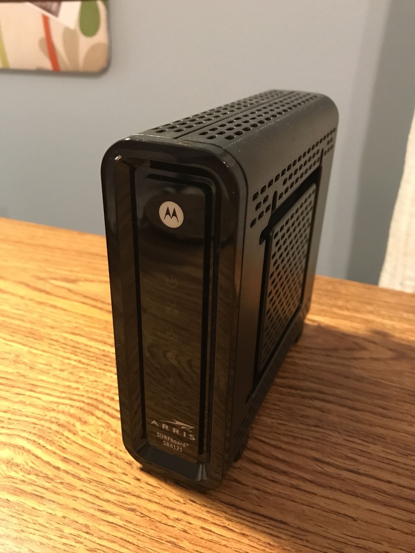 Gently used Motorola Surfboard SB6121 cable modem. Black color. Like-new condition. The SB6121 delivers your complete personal media experience, at incredible broadband speeds. It harnesses the power of DOCSIS 3.0 technology to bond up to four downstream channels and four upstream channels— providing you advanced multimedia services with download speeds up to 172 Mbps in each direction. That makes surfing, shopping, and downloading far more realistic, faster, and efficient than ever before. 4X Faster than DOCSIS 2.0 Download speeds up to 172 Mbps DOCSIS 3.0 Cable Modem 4 download & 4 upload channels Supports IPv4 and IPv6 – the latest Internet standard Compatible with all U.S. Cable Providers Gigabit Ethernet Connectivity Regular $96 online, asking $40.