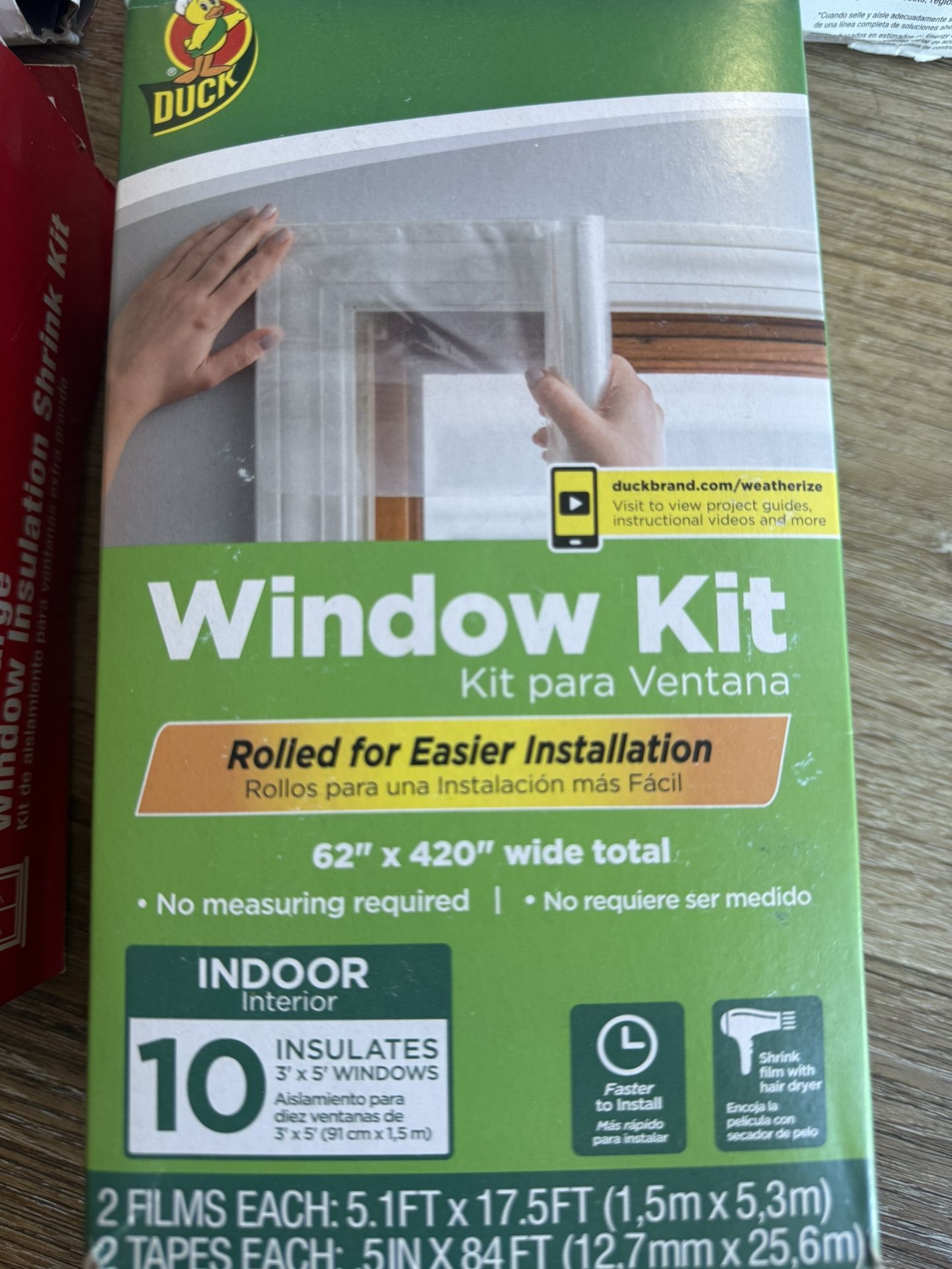 Insulates 10 windows New in a box No tool needs easy Save on energy cost Pickup 91915 During the cold weather months, windows become a prime spot for energy loss. Duck Brand Rolled Window Kits create an added barrier between the outdoor air and the inside of your home, helping block drafts and air leaks that lead to high heating costs. Our window kit film comes in an easy-to-use roll of shrink film, which means no measuring needed simply cut the extra film off once applied. Plus, the kit uses crystal clear shrink film for good visibility and is easy to install and remove. For best results, use on clean and dry surfaces, such as painted or finished wood, aluminum or vinyl.