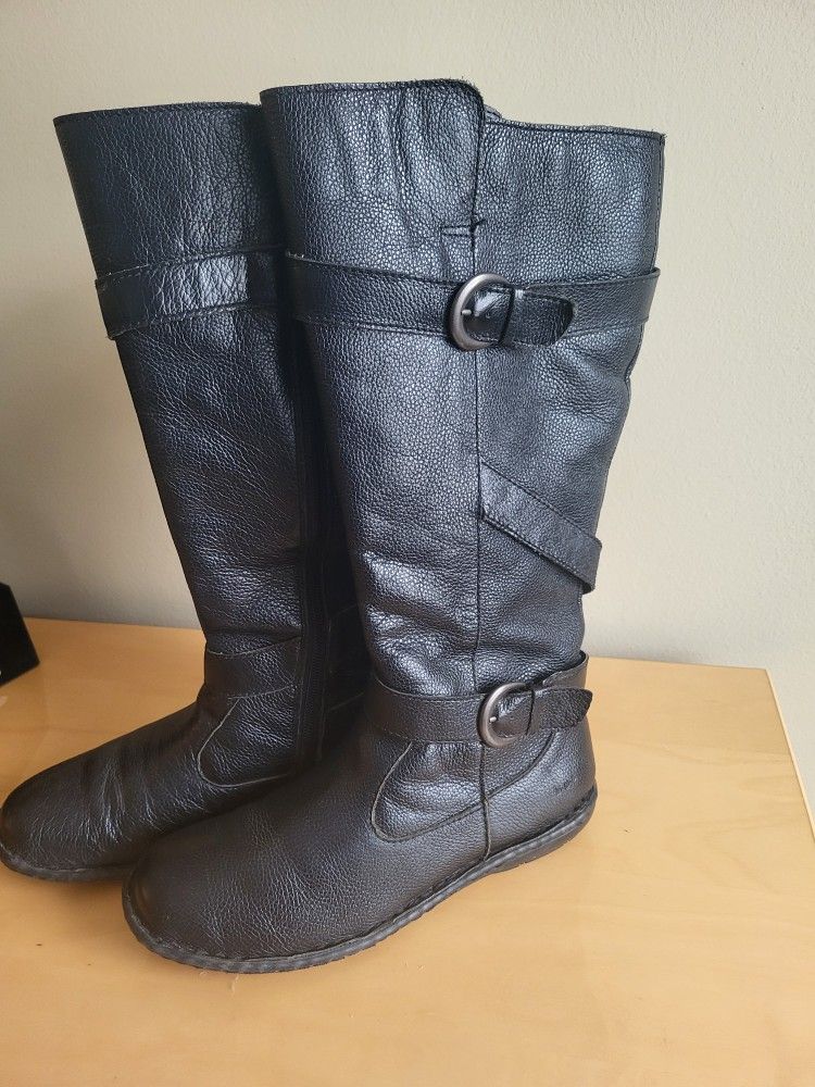 High-quality genuine leather black riding boots made by reputable company Born Concept are super comfortable & stylish. They're in good pre-owned condition. Soft insulated fabric lining & zippers that go almost to heel make them easy to put on & off. Designed for women with wide calves. Asking $12 obo. Easy porch p/u. Smoke/pet free home. X-posted