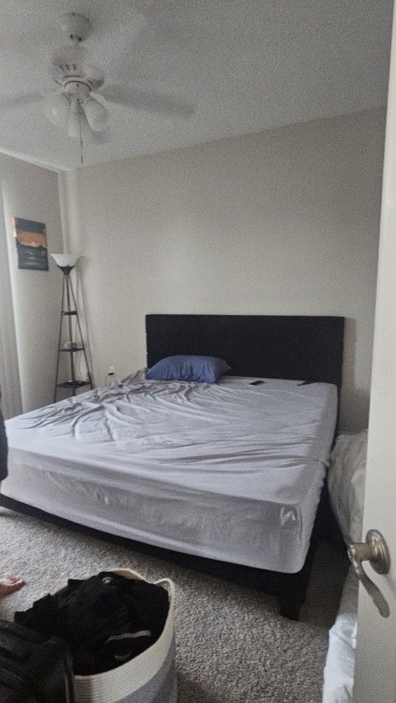 King bed and frame. Mattress is medium firm and only a few months old with a coffee stain at the bottom corner. Frame is less than 1 month old. Need to take it out of the place yourself down 1 flight of stairs.