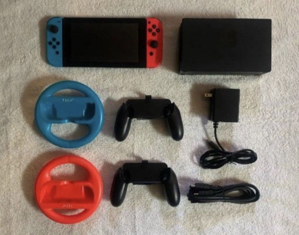 Nintendo Switch with charger,hdmi cable,Tv dock, 2 Wheels and 2 Controller grips The Switch is in great working condition Price is $190 FIRM