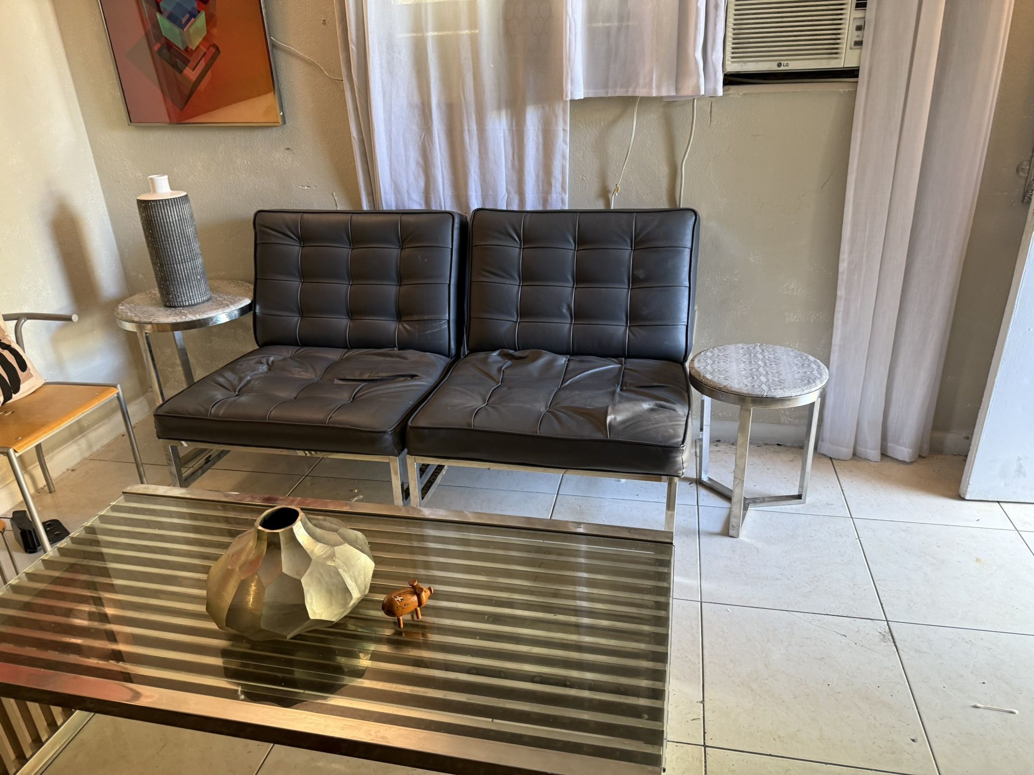 $40 each or for 70 DIY- Great for a quick DIY project to quickly redo some of the tufting. Otherwise , they are strong beautiful chairs in great shape. Function is great but only small aesthetic isssues with some of the tufting but it’s an easy one! Finish: Chrome, smoke gray Tufted, bonded leather cushions Attractive chrome frame Smooth, plastic feet prevent scratches Specifications: Product Dimensions: 32.5"W x 29"D x 34.5"H Seat Dimensions: 29"W x 22.5"D x 17.75" (seat to floor) Product Weight: 35 lbs