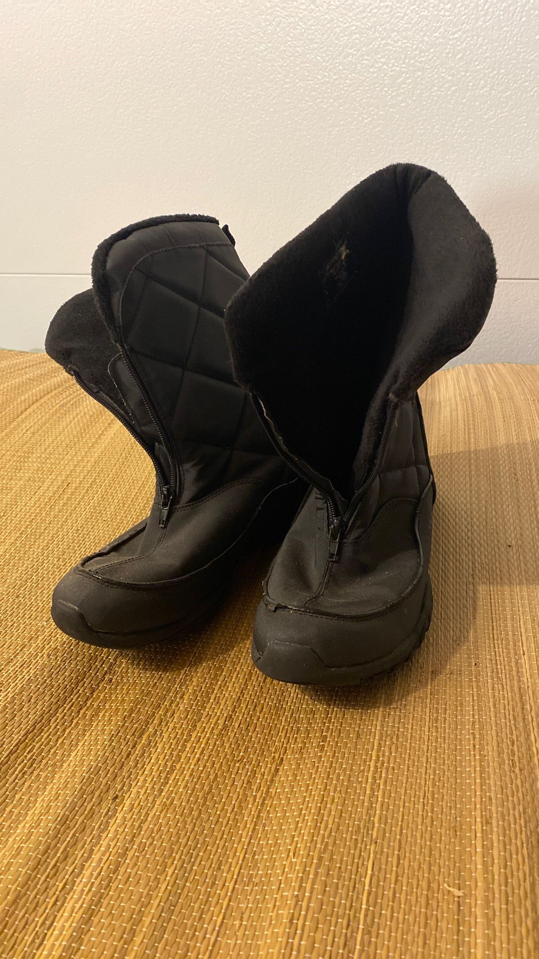 snow + rain resistant boots with faux fur lining and zipper- they say size 11 but im a size 10 and these are too snug for me! so my guess is size 8.5-9 ish in womens (anybody can wear just stating womens for size) probably could fit an 8 and some good socks. Thick and warm! Hard sole should last some time. Check out my page for other goodies! ☺️