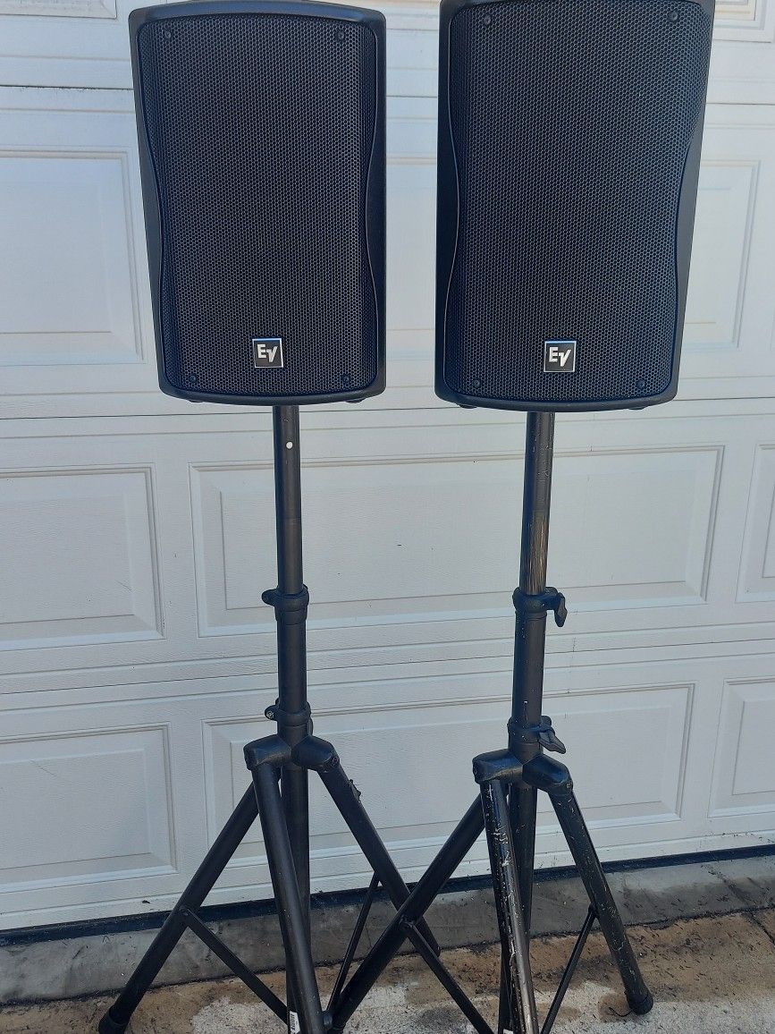 EV-ZXA1 POWERED SPEAKERS IN EXCELLENT WORKING CONDITION INCLUDES: 2 SPEAKERS AND POWER CABLES ONLY. SPEAKER DIMENSIONS: 11.1"D x 10.39"W x 17.99"H The ZXA1-90 is a compact amplified loudspeaker. It is designed for portable sound reinforcement. These speakers use the EV8L, a high output, low distortion, 203mm (8") woofer. It is powered by an integrated 800 Watt, 2-channel amplifier module. The amplifier has XLR microphone and line level inputs, as well as an XLR line level output for daisy chaining several amplified speakers or a subwoofer. The bi-amplified design features steep crossover slopes and woofer excursion protection for maximum output and reliability. A switchable high pass filter allows for use with a subwoofer. The woofer is paired with the DH2005, a titanium diaphragm 1" exit true compression driver. The compression driver is coupled to a rotatable 90 x 50 waveguide for smooth response to 20kHz and excellent pattern control. The ZXA1-90 injection molded enclosure is made from high impact polystyrene for durability and light weight. The handle pocket and pole mount make the ZXA1-90 ideal for many portable applications. The ZXA1-90 speaker enclosure also features a built-in monitor angle for floor monitor applications.