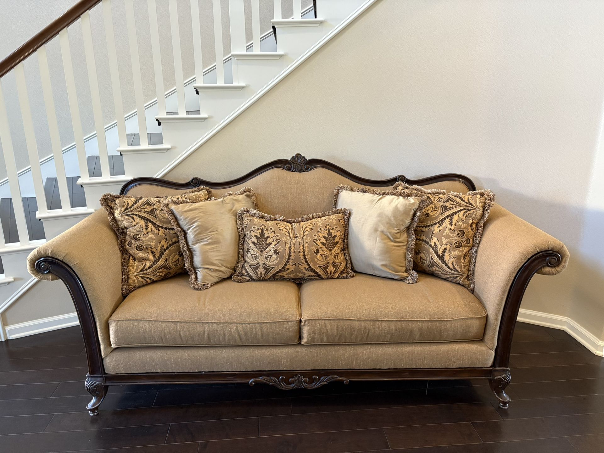 Gold couch with dark brown wood trimming. Purchased from Ashley and very good quality. Very gently used. We kept it in our formal living room and hardly ever sat on it. Minor scuffs on the feet from when we moved. 5 gold pillows included. Measures 90” x 37”.