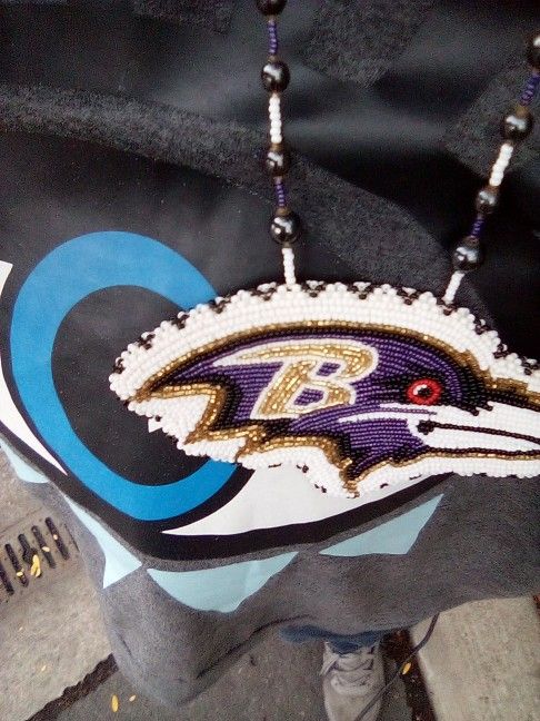 Baltimore ravens logo in peyote stitch with a leather necklace