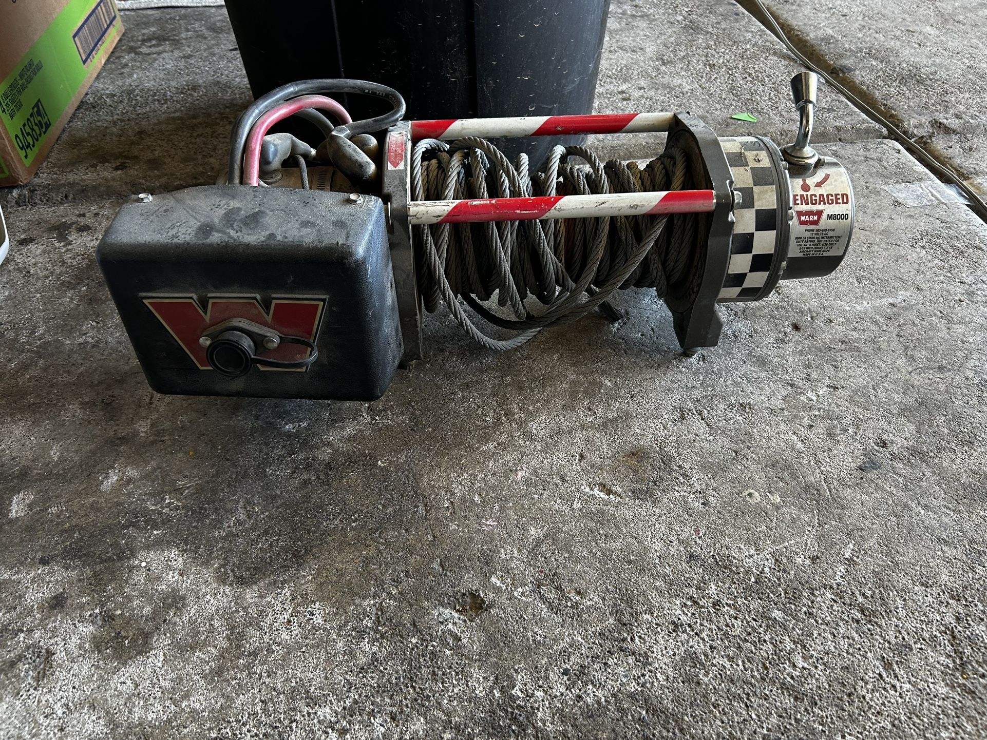 WARN electric winch with steel cable. Includes control box and wired remote. Heavy-duty older model built solid. Great for trucks, trailers, or off-road use. Used condition. Selling as-is. Pickup only. 95 and college