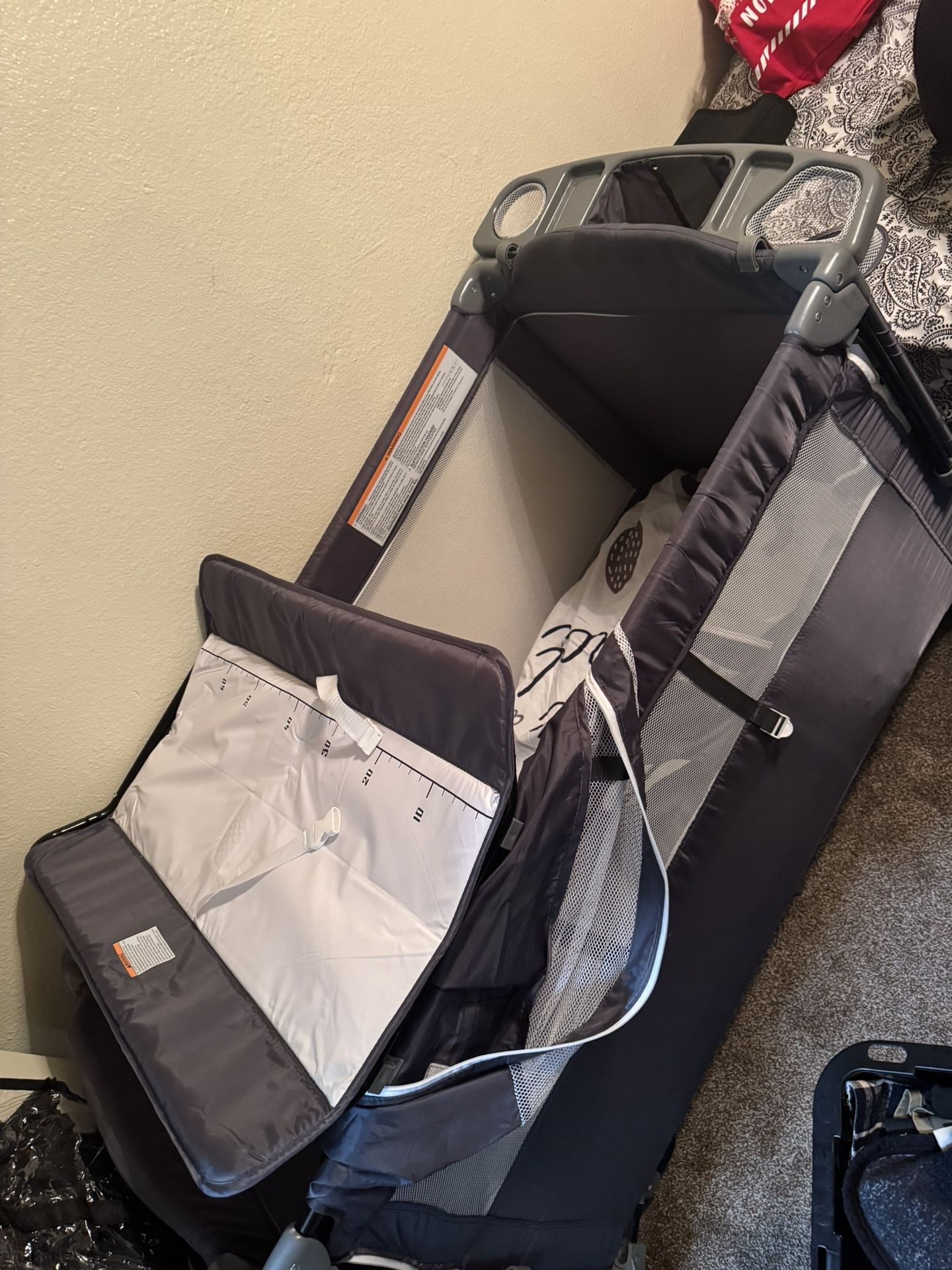 Selling a portable fold up bassinet has changing table, bed pad, rocks in place, also has play pen setting and in-and-out zipper on the side Mattress was separate and hardly used but is included in the purchase any questions just msg $150obo