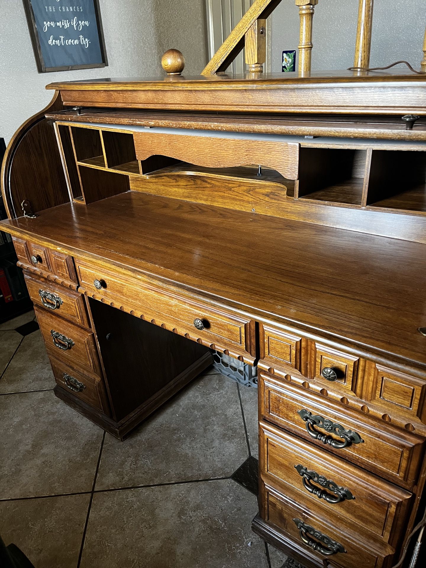 Beautiful roll top desk. Solid and in great shape. $80 Chair not included. Pick up only. Height 42.5 in, length 52 in, and width 22 in.