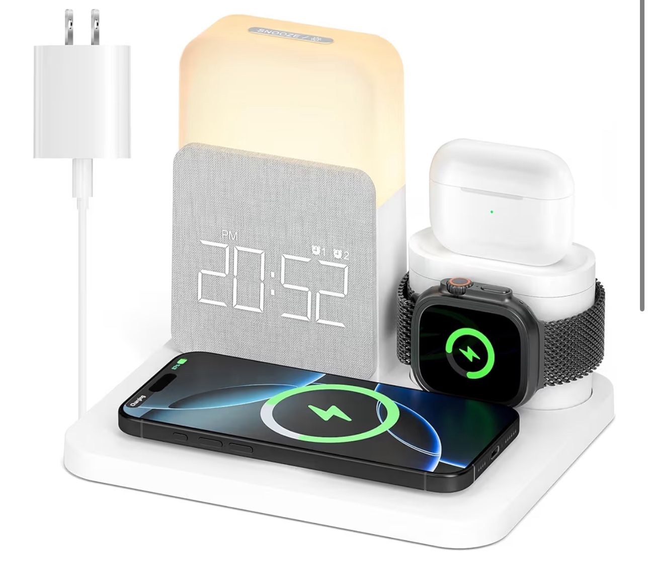 Simplify your nightstand with this 3-in-1 Wireless Charging Station, designed to charge your iPhone, Apple Watch, and AirPods all in one place. Perfect for home, office, or bedside use. This sleek charging stand also features a digital clock and soft night light, making it both functional and stylish.