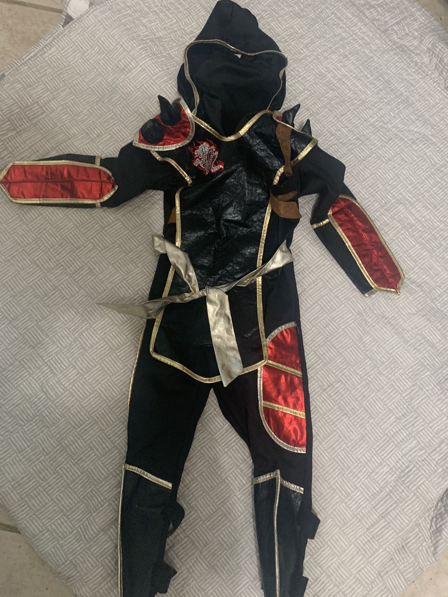 Has a hoodie and an optional partial face covering. Not sure if the size but fits 3-5 year olds