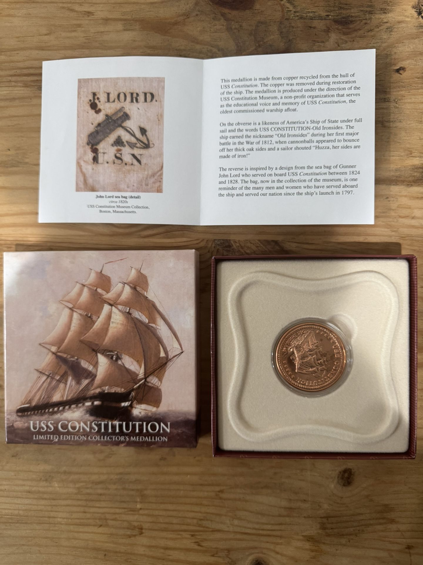 Medallion is made from copper sheathing removed from the hull of USS Constitution during the ship’s 1(contact info removed) restoration. It measures approximately 1.52” in diameter and weighs approximately 20 grams. In 2018, a limited edition of 6,000 pieces was struck in Providence, Rhode Island.