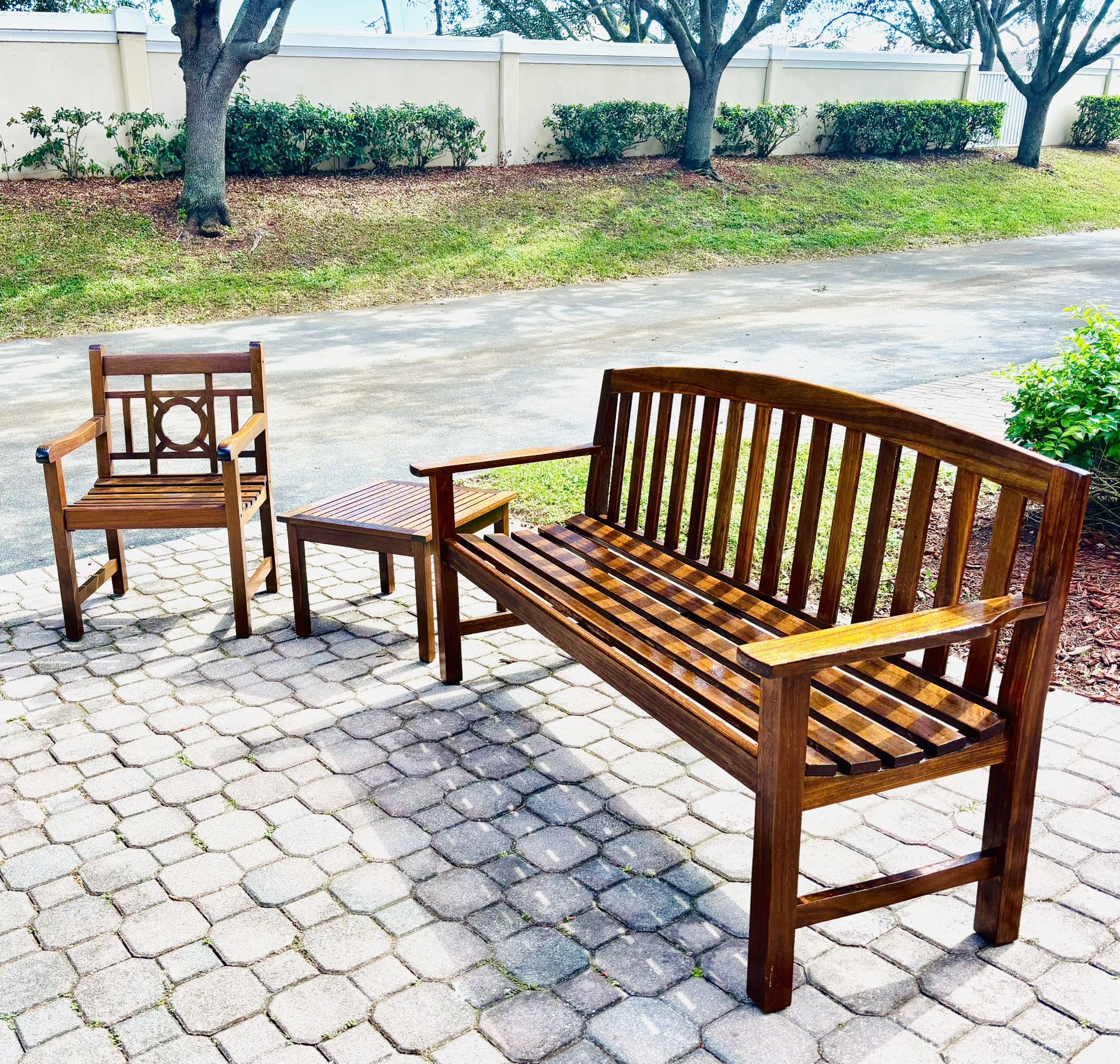 Beautifully refurbished indoor/outdoor teak furniture. Built to last another 20 to 30 years. Weather sealed and complemented with a beautiful teak stain.