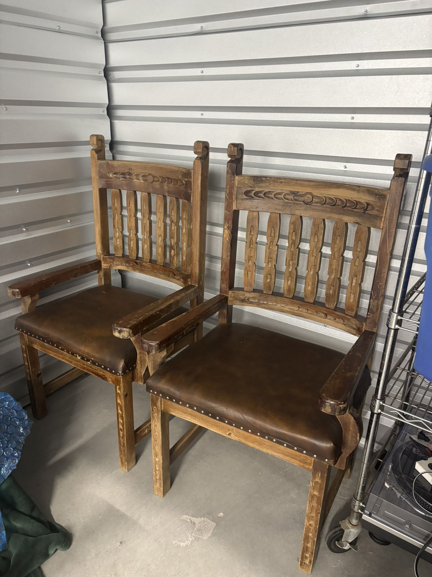 Large handmade wood and leather arm chairs