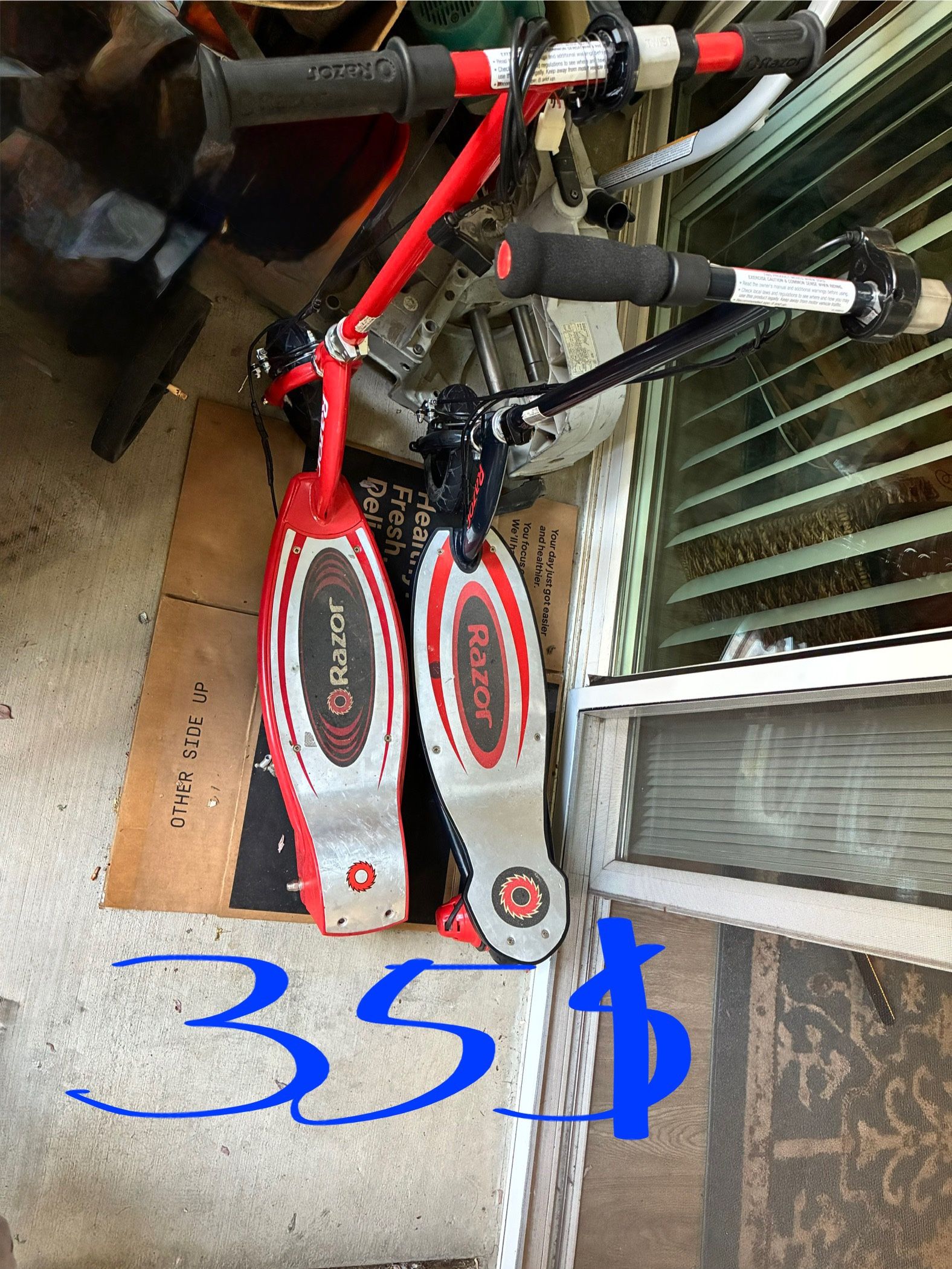 2 razor scooters. The red one has a messed up throttle, black one was working when my kids used it. They have been sitting for a long time so unknown condition now. NO CHARGER. Sold as is