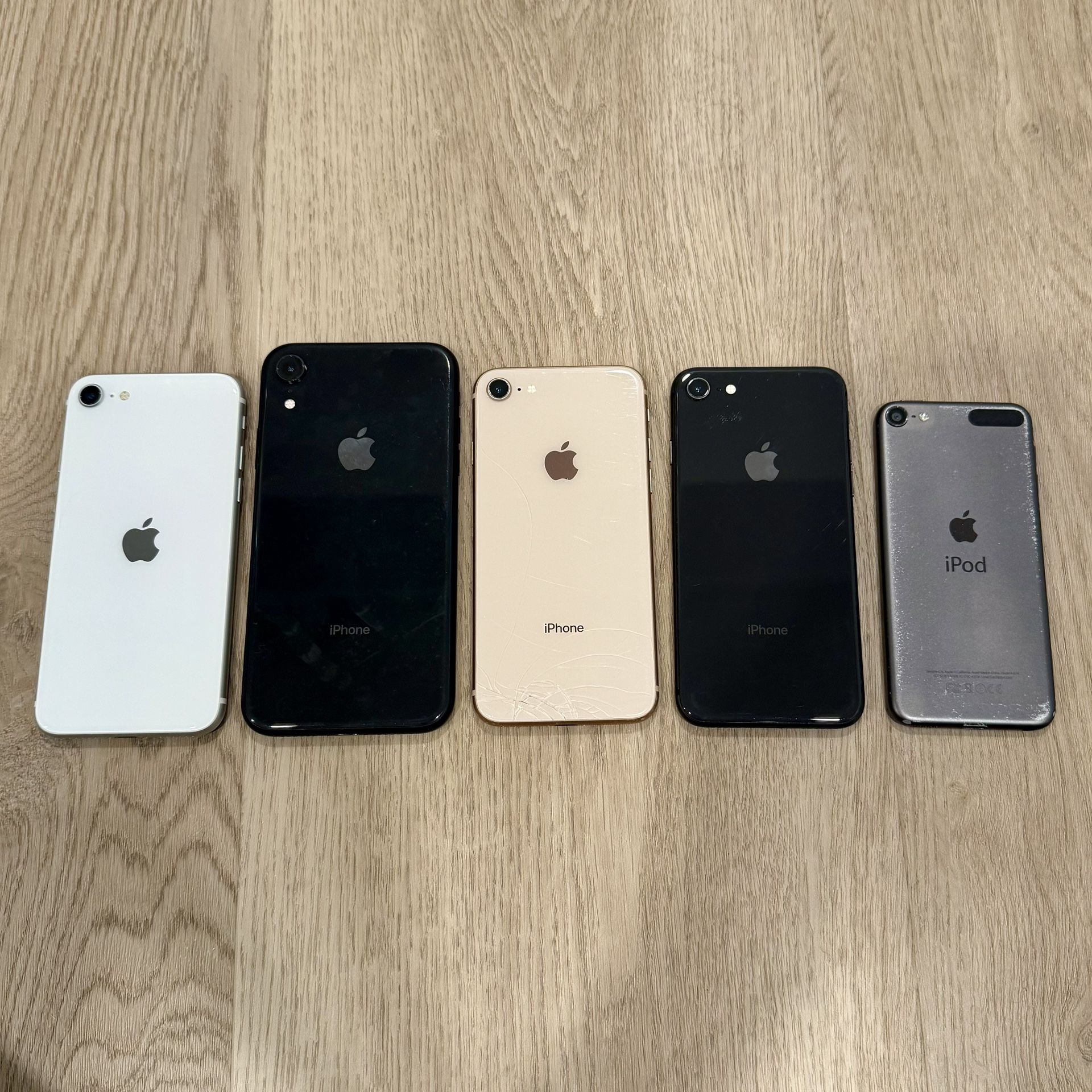 • iPhone SE 2nd gen: passcode locked, screen does not work. • iPhone XR 256GB: Unlocked any carrier but screen is cracked. • iPhone 8 Space gray: Activation locked • iPhone 8 Gold: Activation locked • iPod Touch 6th gen 16GB: Factory reset & ready to use but needs screen replacement. Also willing to sell separately, message for price. Cash only. As pictured. Face to face, cash only. Thanks for looking :)