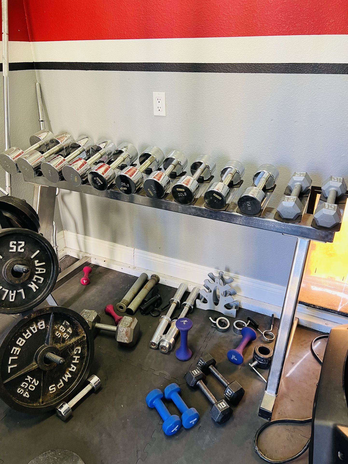 7x Dumbbell Sets of Pairs - 5-35lbs, plus a solo 40lb dumb bell w/sturdy steel weight Rack (Picture for Reference). Everything is in good condition and ready for immediate pickup.