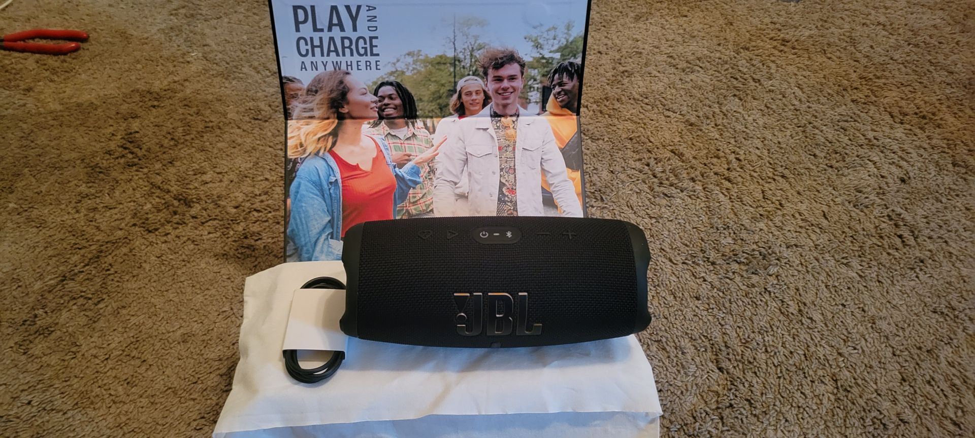 Jbl charge 5 wifi 20h play time Wifi certified BT ,works with apple Airplay , Spotify, Chromecast built-in works with Google Home , works with Alexa , has a power bank compatible with jbl one app