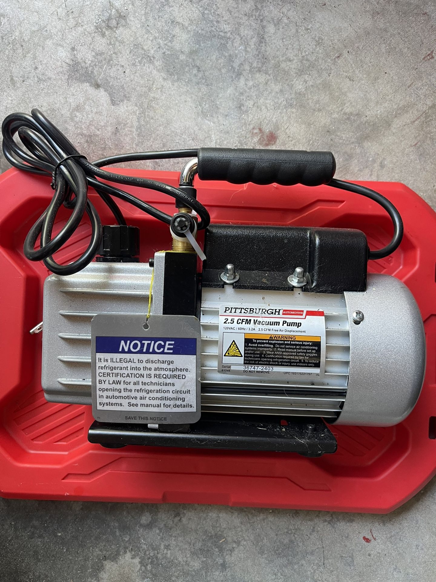 Pittsburg automotive 2.5 CFM Vacuum Pump 120 vac/60hz/3.2 Designed for deeper vacuum draw, this vacuum pump pulls vacuum down to 75 microns. Precision machined one-stage pump removes moisture from air conditioning systems to safely add refrigerant. This one stage vacuum pump is ideal for automotive air conditioning, HVAC work and other operations that require high vacuum pull from a compact pump. One stage pump draws vacuum down to 75 micron Durable die cast aluminum housing and convenient top handle for easy maneuvering Easy-access oil fill port with viewing window for easy maintenance (oil included) Dual ports for R134A and R12/R22 systems Thermal and current overload protection