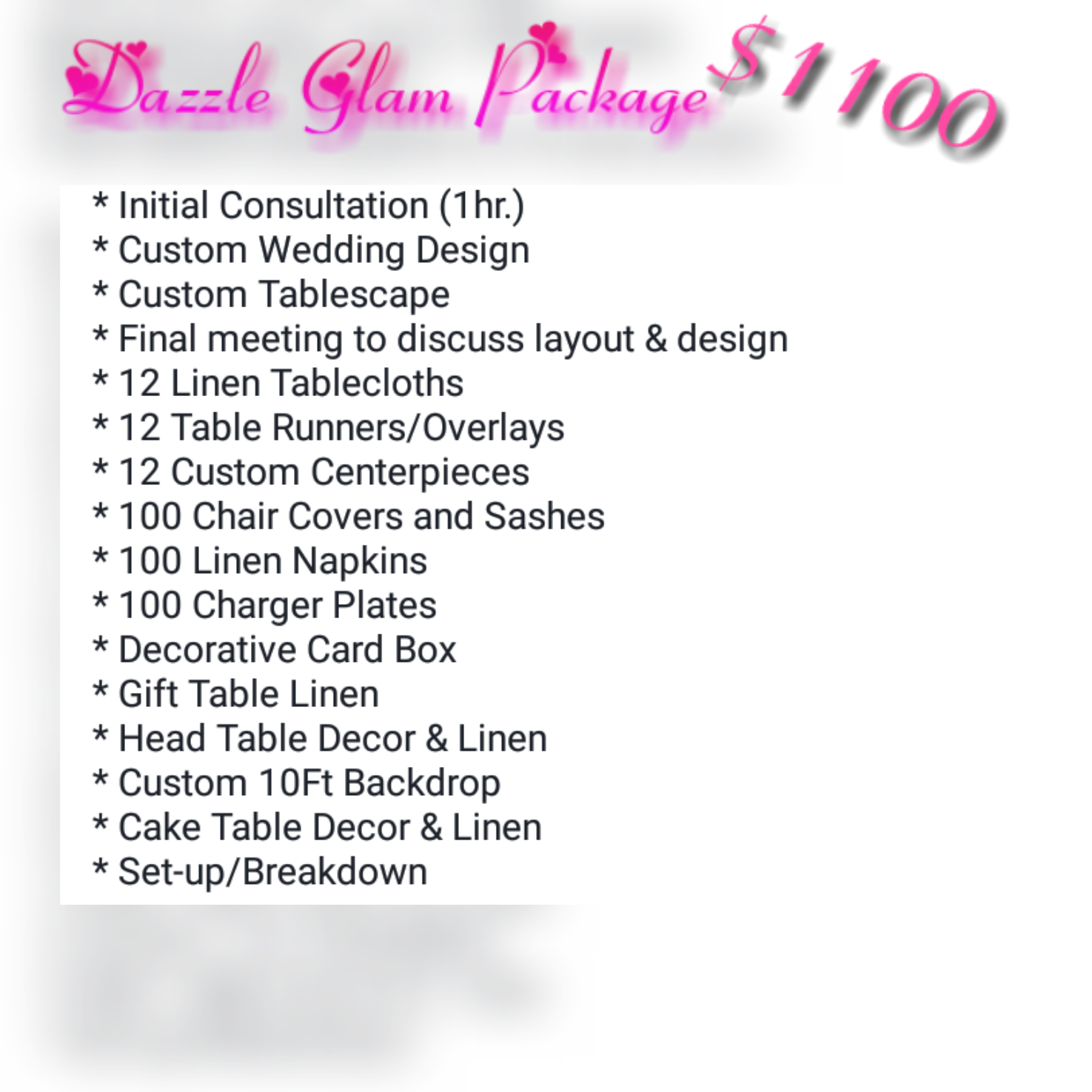 $2.00 black, or white Spandex Chair Cover Special (including sash color of you choice) ----------------Like Our Business Page-------------------- Dazzle Me Creations booking for all 20172018 Events call us to beautify your next event. We are your 1 stop shop. Rither your budget is big or small we are here to make memoriesπππππππππ°. {contact info removed} Ashley Event Planner/Decorator Full Rental Linen Service Chair Covers/Sashes Centerpieces Catering Services also available starting at $8.00 per person.