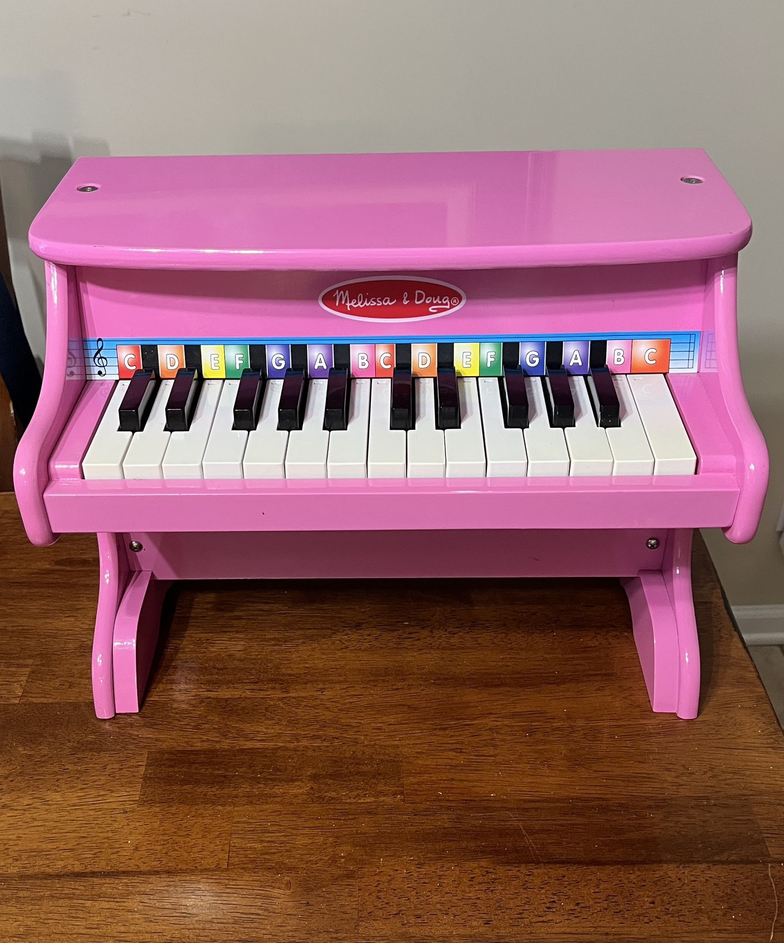 This is a Melissa & Doug Learn-to-Play Toy Piano, designed for children ages 3-5. It has 25 keys and two full octaves.The keys are color-coded, making it easier for children to learn to play. It is made from solid wood and other high-quality materials to ensure durability and safety. The piano is designed to help children practice eye-hand coordination, auditory and memory skills, and fine motor skills. Dimensions are 16.5 x 11.8 x 9.7 inches. This is a quality built item.