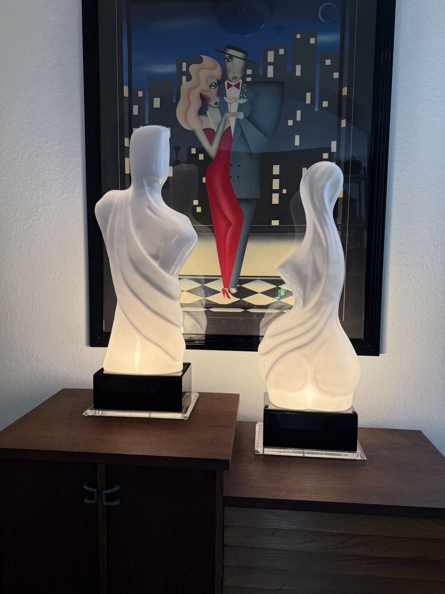 Vintage Monumental 80s set of 2 White Acrylic Men's and Women's Torso Lamps with Black and Transparent Lucite Base
