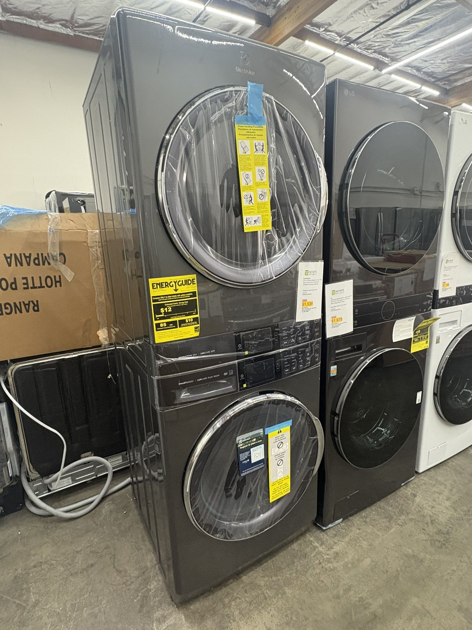 ELECTROLUX 4.5 cu. ft. Stacked Washer and 8.0 cu. ft. Gas Dryer Laundry Tower in Titanium with SmartBoost Premixing, Energy Star Dimensions: 76.25 "H x 27 W x 32 D OPEN BOX Model:#ELTG7600ATO Delivery available 1 year warranty Come visit us! Open 7 days Hablamos espanol Reg price $2,799 Sale price $1,539 Take it home today only $39 down No cred1t needed