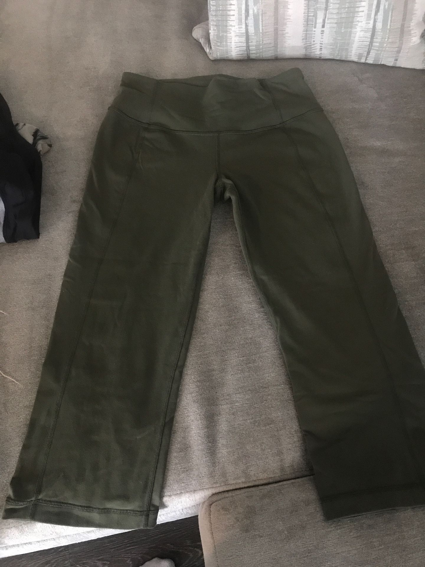 Good. Used condition. Cute detail on back of leg (calf area) cute pocket in the back to hold card or keys . Very comfortably fitting for workout or home use. Olive green. MPU or can meet at premium outlet mall.