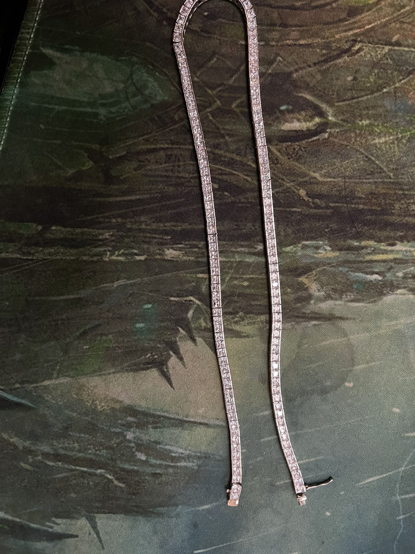 The clasp is bent and a bit finicky but it is a .925 sterling silver 17inch long with cz stones