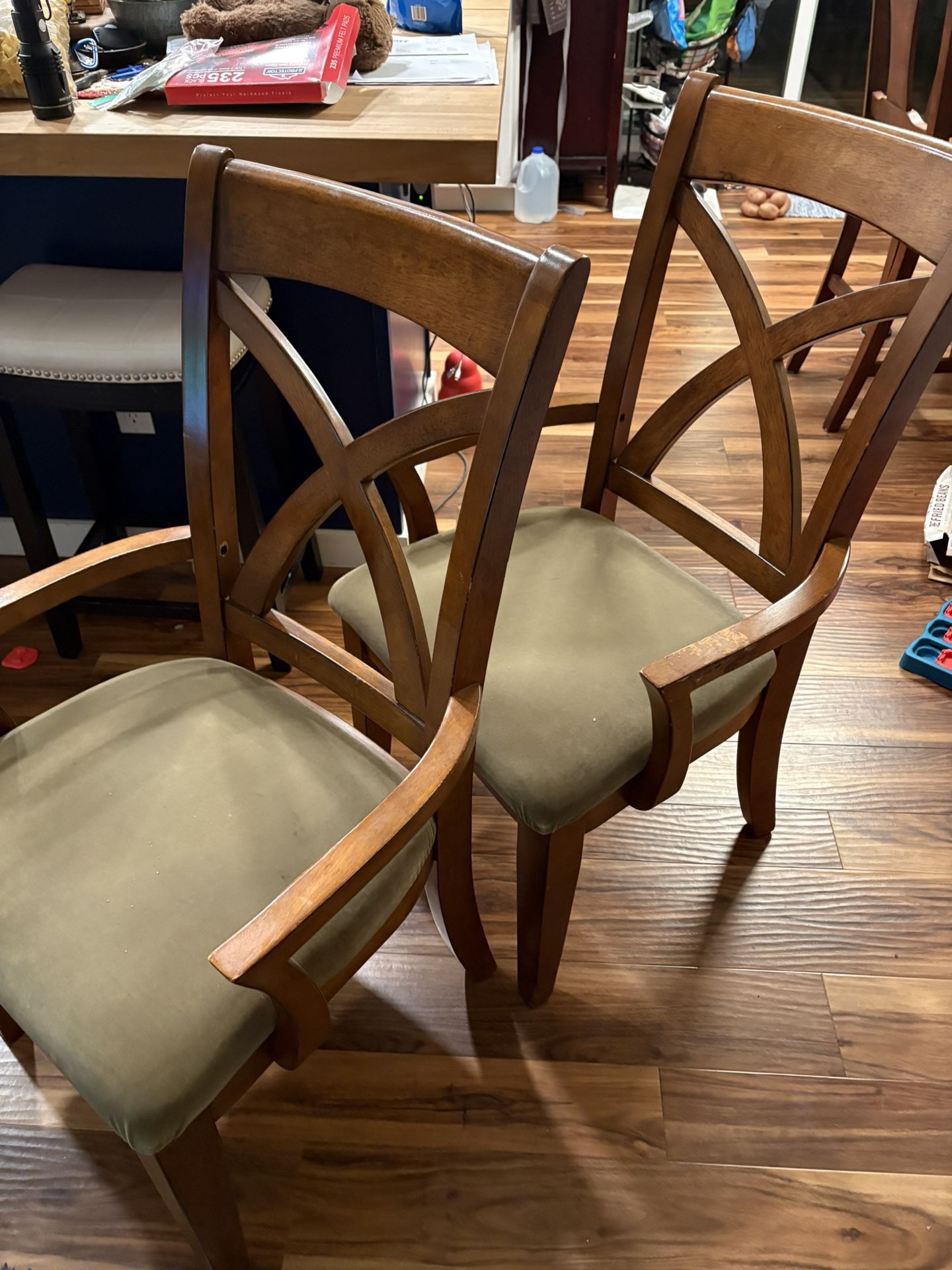 Sage green padded seats. Wood needs refinished-lots of scratches, but chairs are comfortable and solid. 2 with arms, 4 regular chairs.