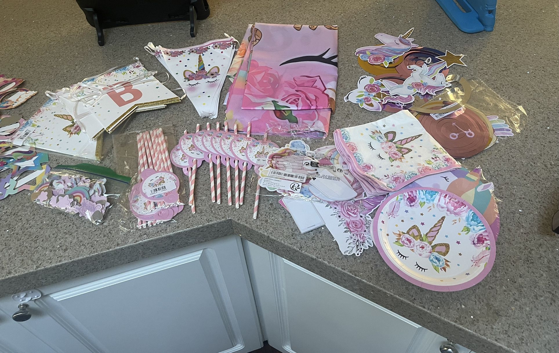 Everything is in great condition and some things are even brand new. 24 brand new straws 6 round new dessert plates 14 unicorn new shape dessert plates 7 new napkins 13 paper glasses 12 swirls( we only used few of them) 6 honey comb centerpieces (we only used few) 2 happy birthday banners 1 triangle banner 1 backdrop 180x135cm ( 5x4ft) A zip lock bag of unused confetti’s All for 30$