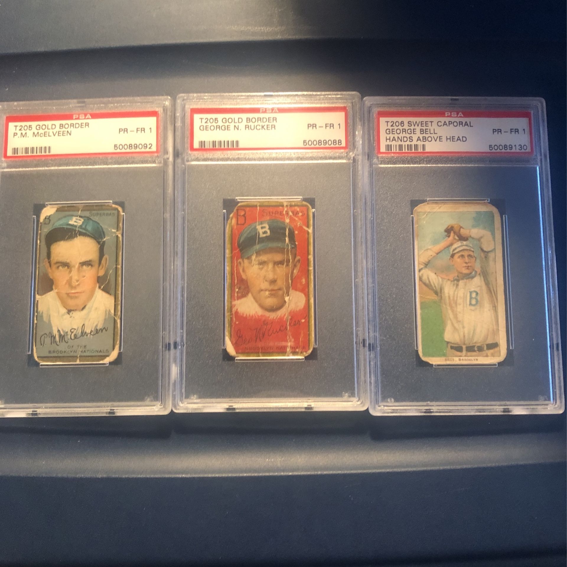 PSA Authentic Brooklyn baseball cards. 1911 P.M. McElveen Brooklyn. Gold border. $75 1911 George Rucker Brooklyn. Gold border. $100. 1909 George Bell Brooklyn. Hands above head. $100 Great Father’s Day for sports fans or collector. Message with questions and offers.