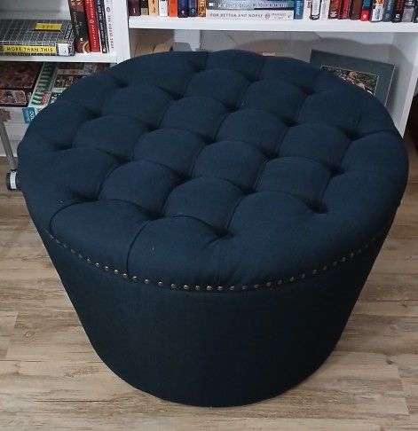It has a sturdy frame made of high-quality materials to prolong its use. This blue round ottoman features a tapered base and plush thick padded top upholstered in pretty linen with a quilted exterior. It also includes decorative nail tips on the edges of the removable lid for added appeal. Plus, it's more than just an eye-catching accent piece. Remove the top and inside is a widely suitable interior to store additional pillows, sheets, and more.