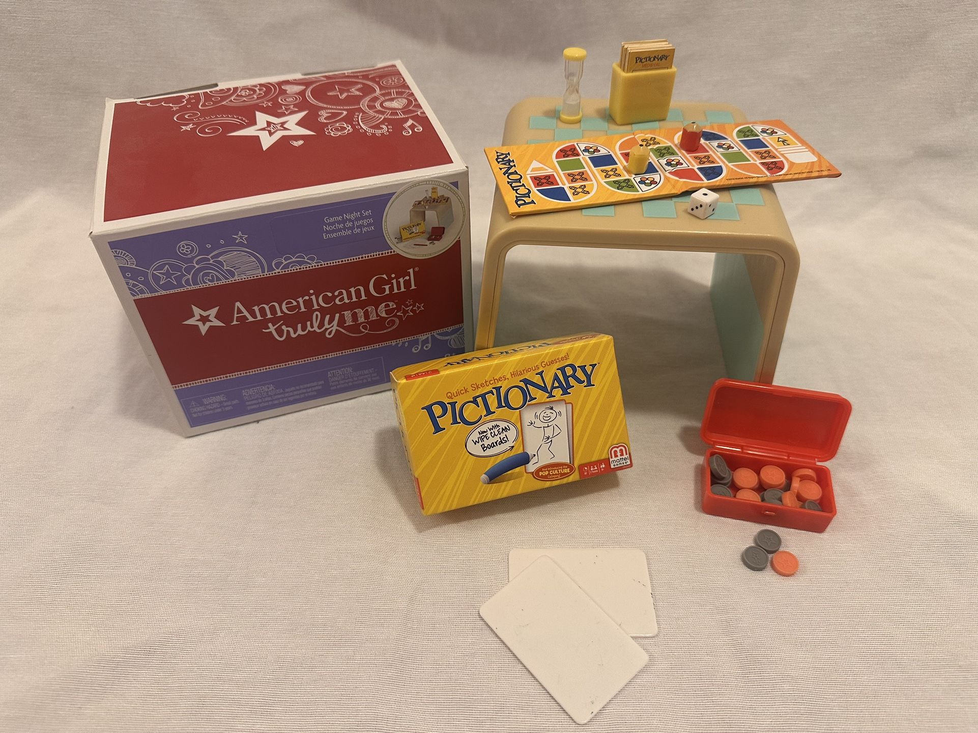 Authentic American Girl Doll Game Night player with Pictionary and checkers. Box included. Great condition! All pieces in tact and in great condition except for the pencil. It is missing from this set.