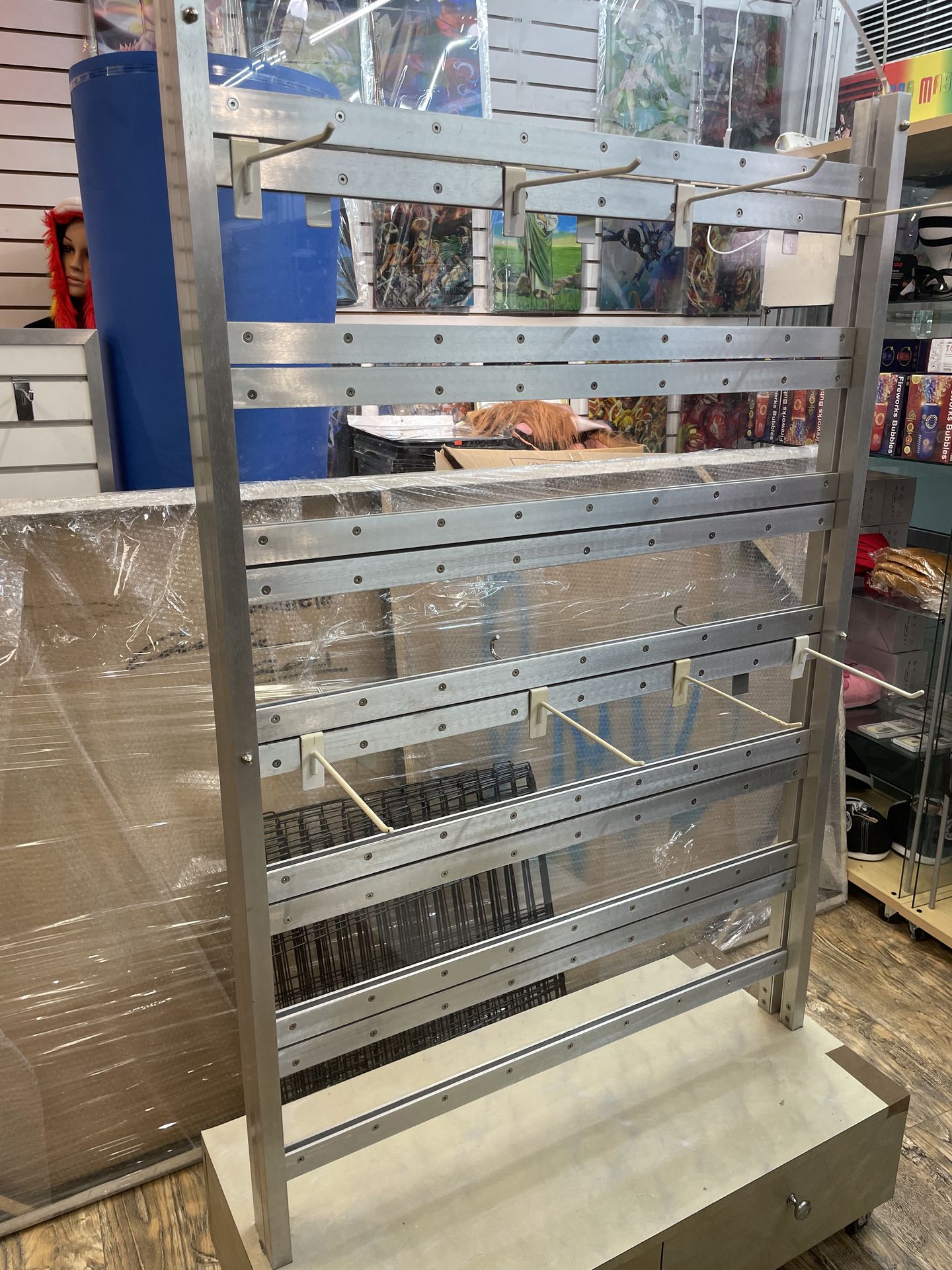 Clear display where you can hang clothing, bags, hats, etc. It has 2 drawers at the bottom for more storage. Measurements: Height: about 49 inches without the wheels Wide: about 36 inches