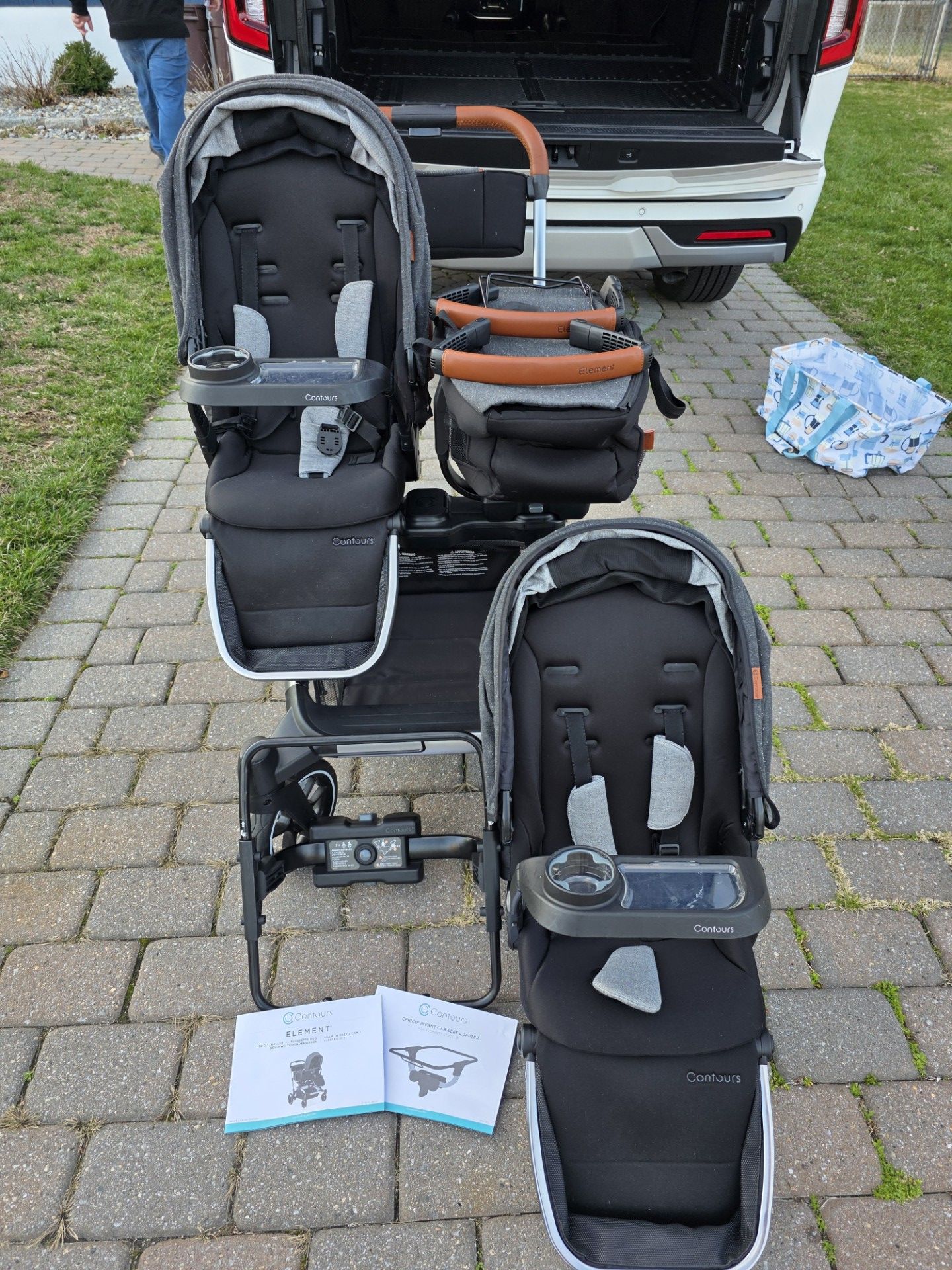 Good condition contours element side by side double stroller. 1 strap on the seat has a little wear as seen in photos and the handle to the stroller has a mark from being in my trunk against something and is also shown in the photos Stroller itself is clean and from a smoke free home. Mostly kept in storage in my trunk and only used a couple of times. This is a piece by piece double stroller. It originally came with the 1 toddler seat and the snap on storage carrier. We purchased the chicco universal adapter, the second toddler seat, and 2 trays for the toddler seats separately. I also have the original handles from the toddler Seats that we switched for trays instead. Stroller itself retails online for $700-800+ Additional toddler seat retails $200+ Chicco car seat/baby carrier adapter retails $50+ Trays for toddler seats retail $40 each i have 2 Im selling it all as a bundle for $650 or best reasonable offer. Pickup in Hamilton 08619
