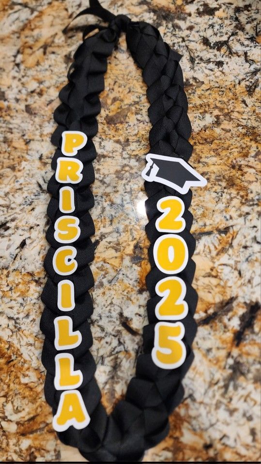 Made to order Personalized Lei! I offer several options! Bring me your idea & I'll work to make your vision come to life! OPTION 1 - pick any 2 colors! Plain ribbon lei $10 (perfect if you want to decorate yourself) OPTION 2 - pick any 2 colors! Year & graduation cap $15 OPTION 3 - pick any 2 colors! Year & graduation cap, personalized with any name! $20 (most popular) OPTION 4 - pick any 2 colors! Year & graduation cap, personalized with any name, one specialty design! $25 I can have your lei ready next day! Same day rush orders require full payment at time of order! Otherwise, payment due at time of pick up! All lei's will have black & white lettering, and use bubbly font unless otherwise requested something different. All lei's will be closed "necklace" style unless a request for the open style is made. (No additional charge). *Any additional specialty designs (including glitter cardstock design) add $5 **If you'd like a 3 colored lei add additional $5 ***Rush same day orders add $5 (payment due at time of order) ****shipping is available - priority mail $10 flat rate